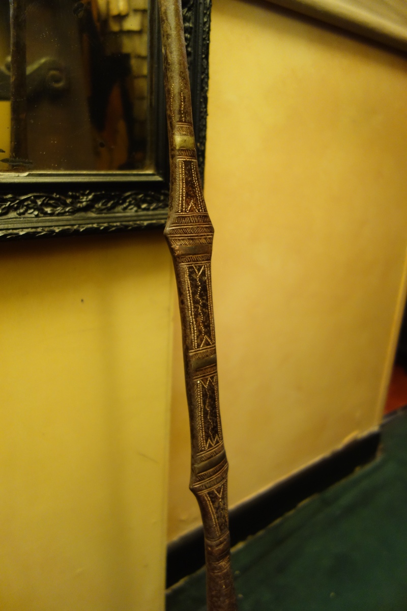 AFRIQUE. SAGAIE en fer, la poignée finement ourlée de perles à la façon du cuir.