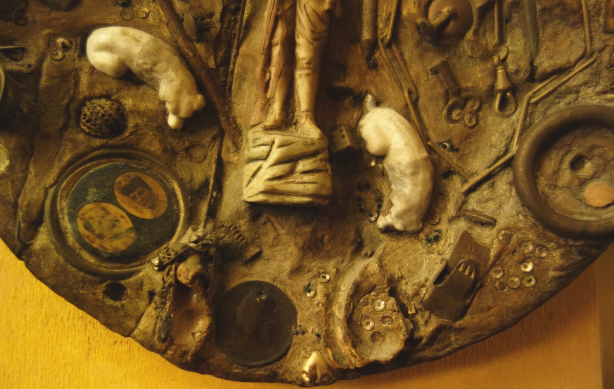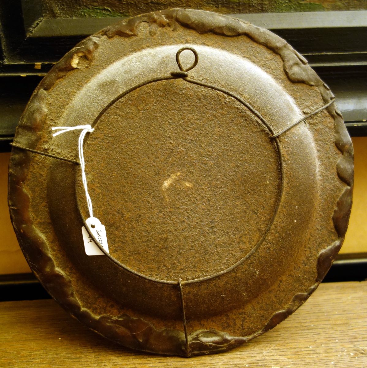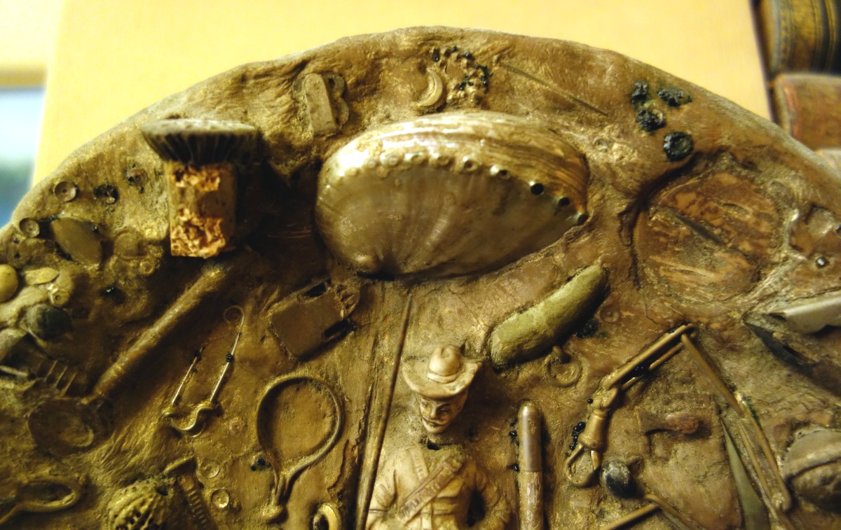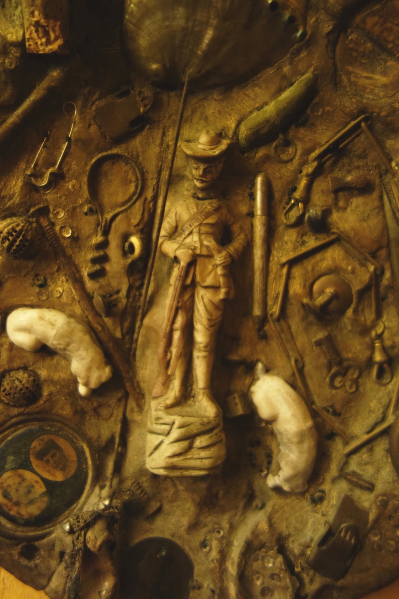 AFRIQUE du SUD - BOER. ASSIETTE en métal incrustée de divers éléments de la vie quotidienne : petit soldat, chiens, coquillages, boutons d'uniforme, clous, épingles, noix, pièces de monnaie….