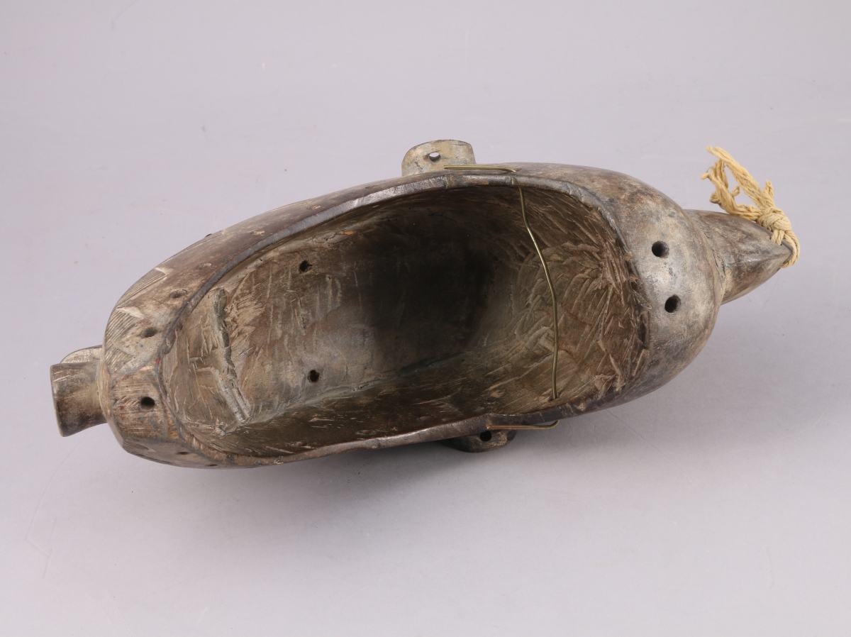 AFRIQUE. MASQUE en bois sculpté, traces de polychromie, tissus et métal. Le nez proéminent, les joues scarifiées, sommé d'une crête.