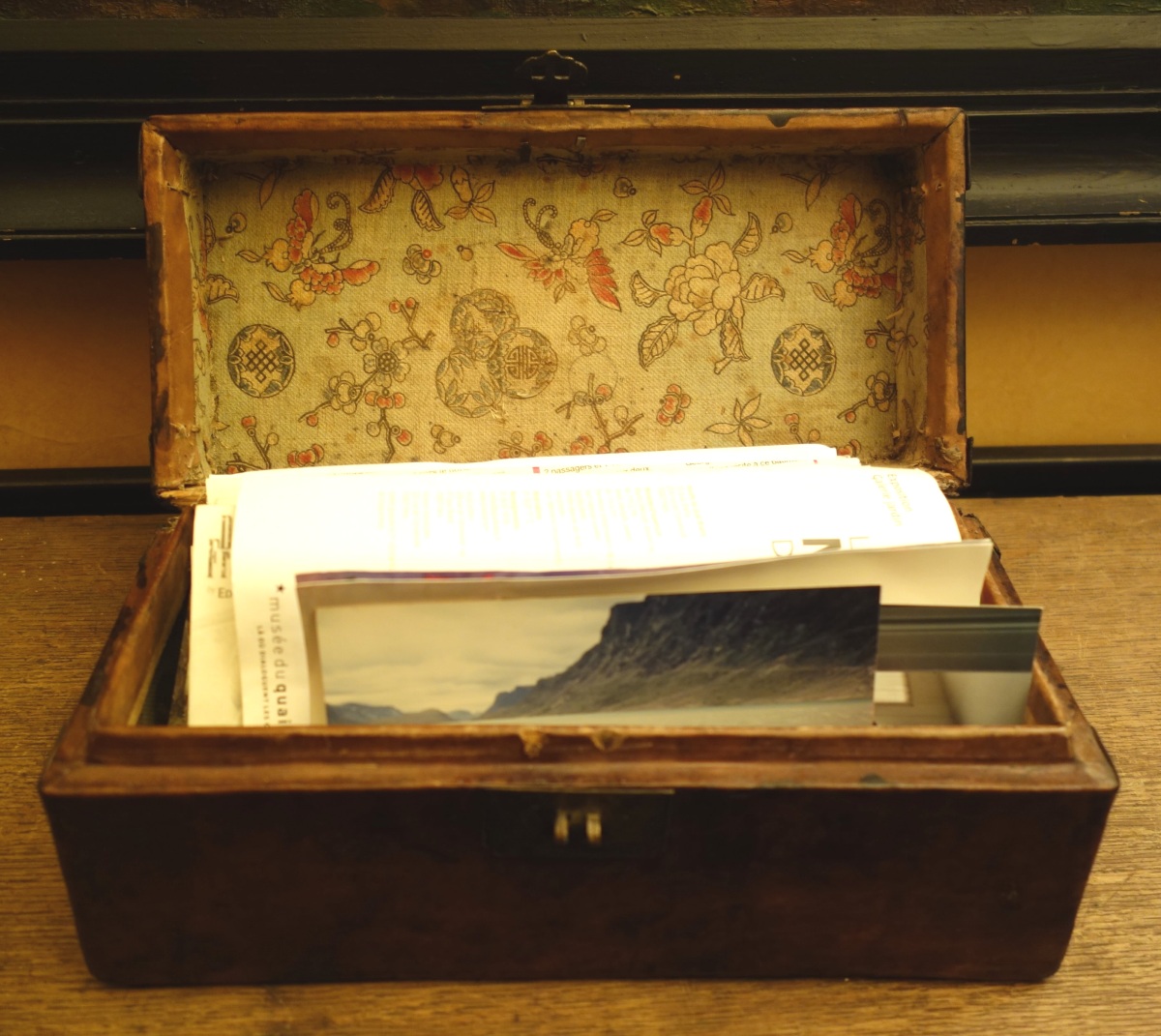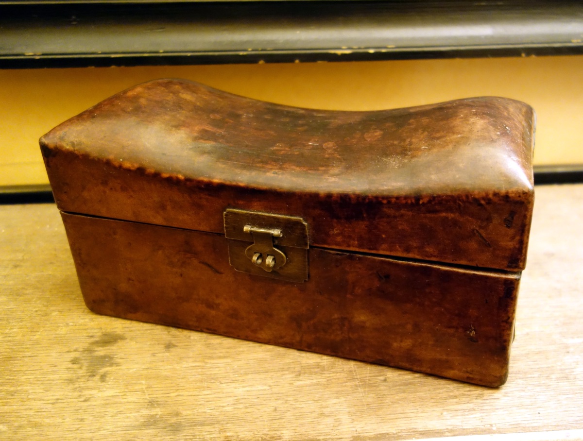 AFRIQUE du NORD. COFFRET APPUI-TETE en cuir de chameau.L'intérieur gainé d'un tissu japonisant.