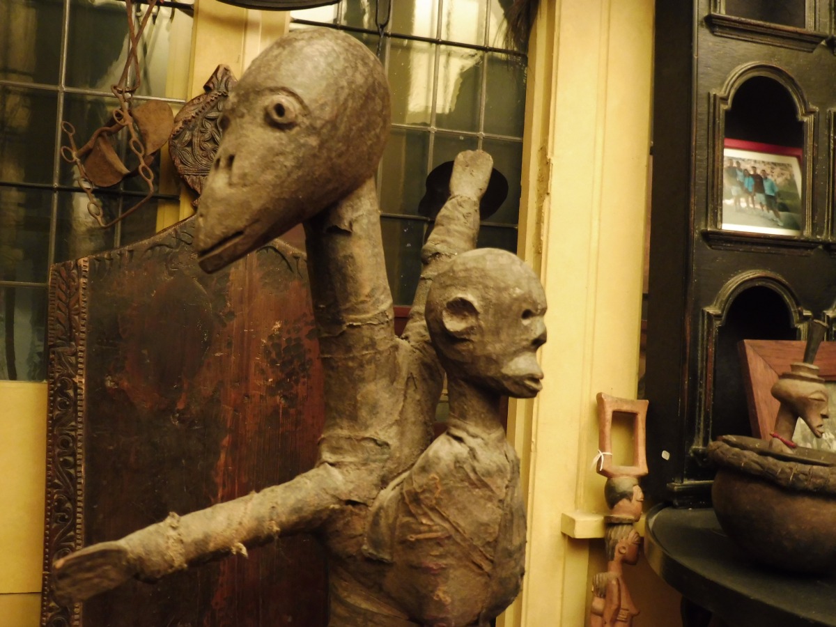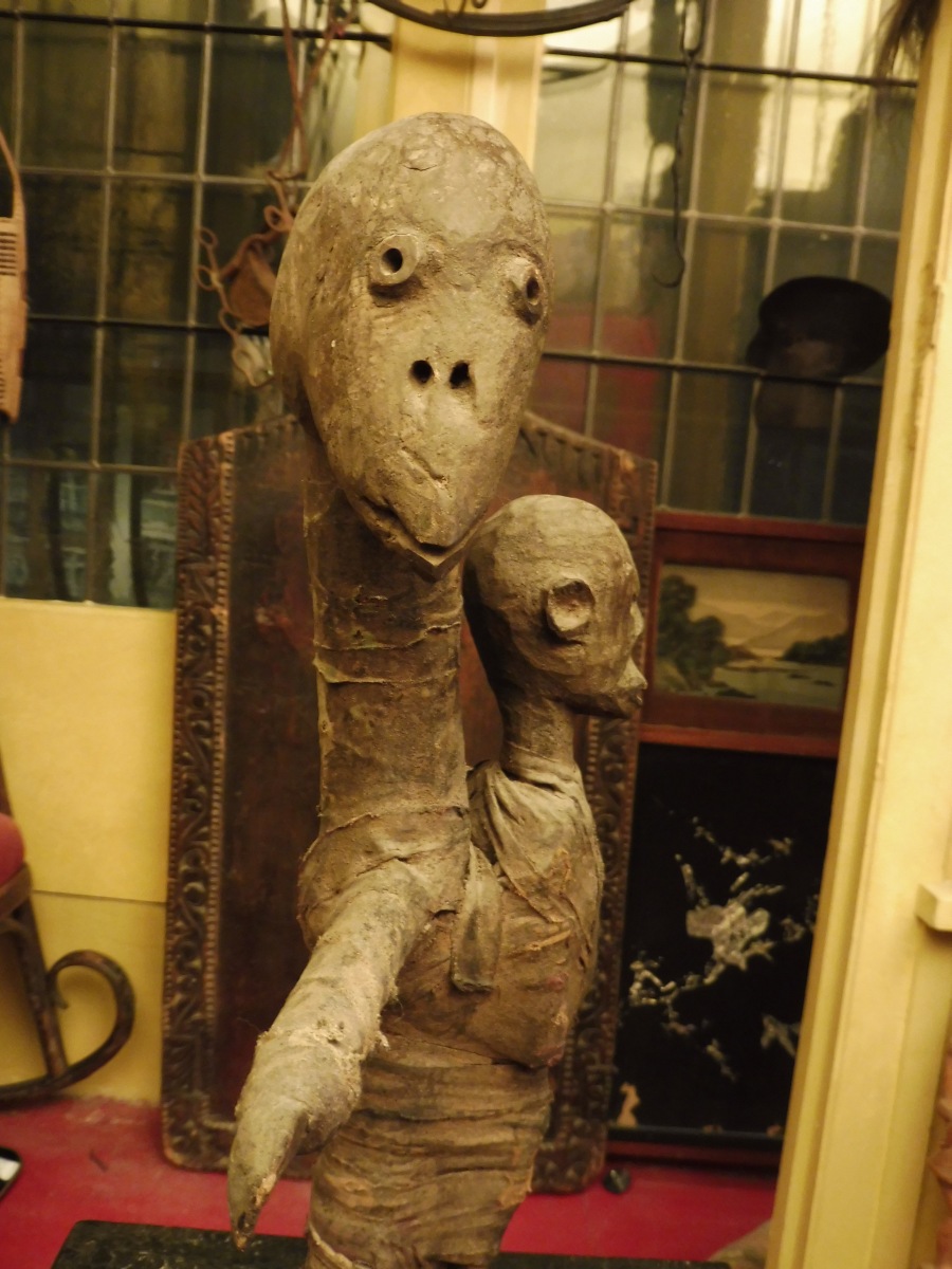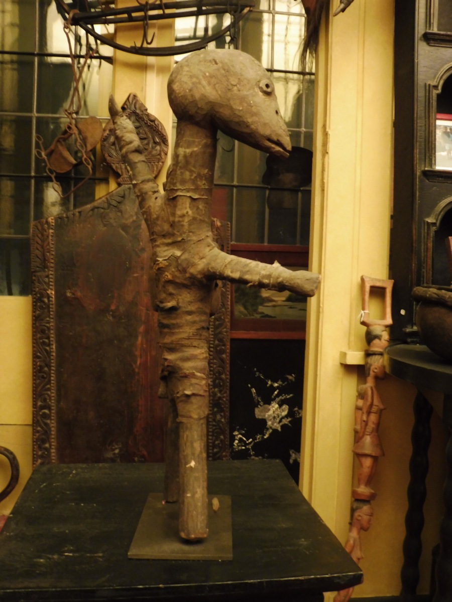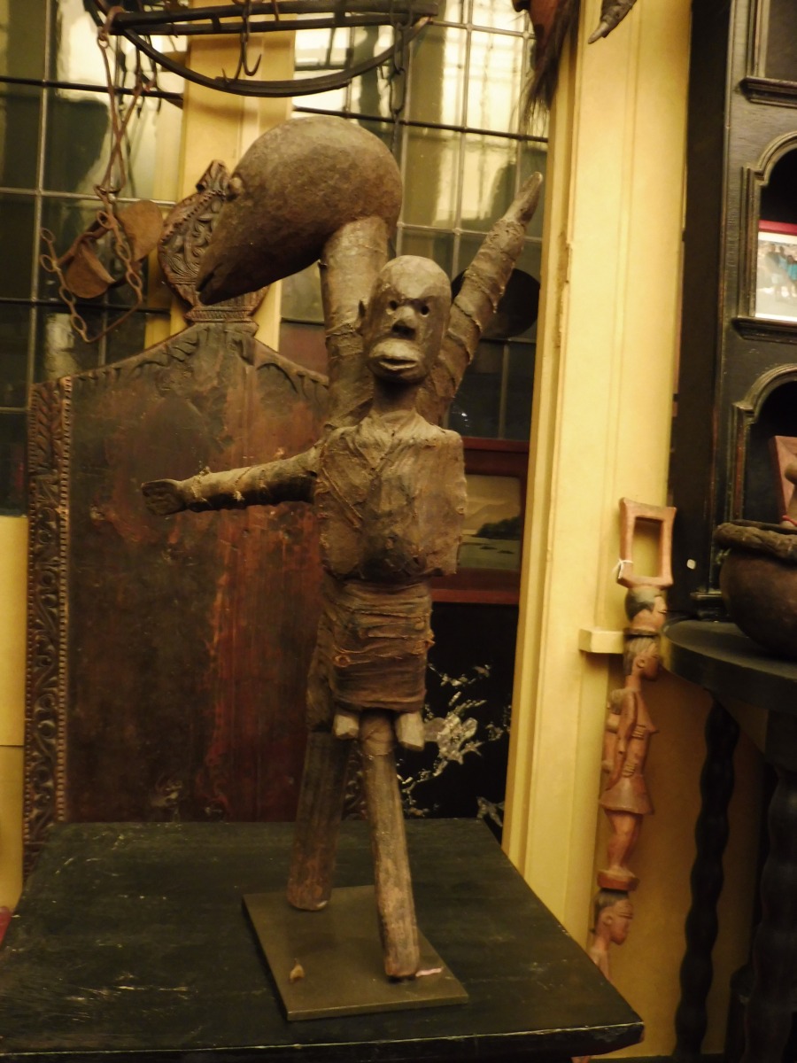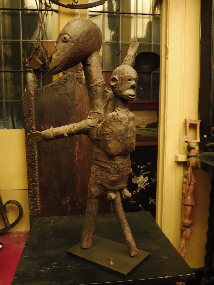 TANZANIE. HOMME-OISEAU portant son enfant en bois, tissu et métal.