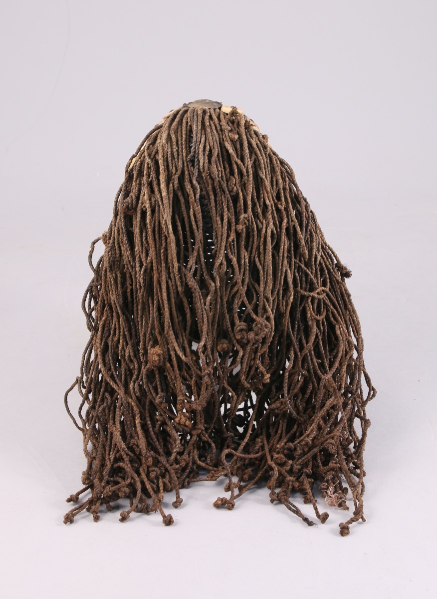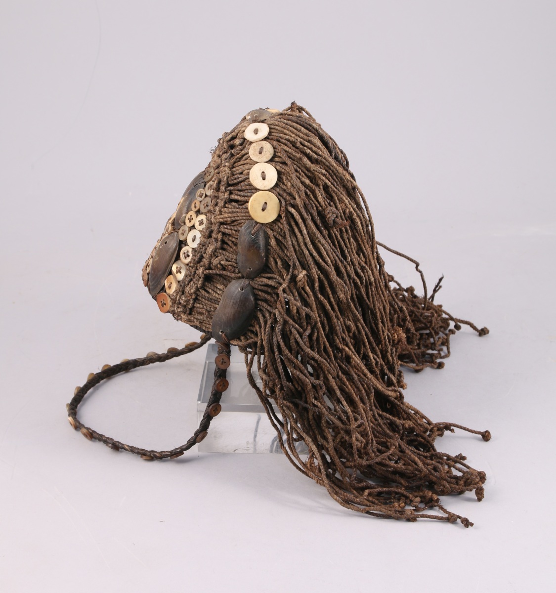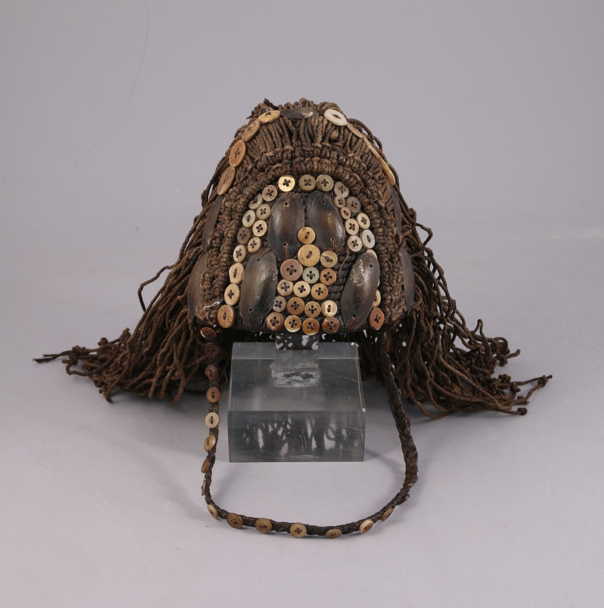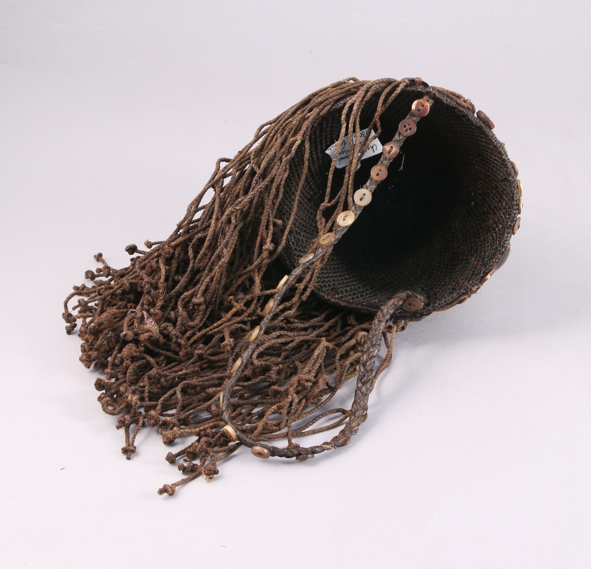 CONGO - LEGA. COIFFE RITUELLE en vannerie, fibres végétales, coquillages, moules.