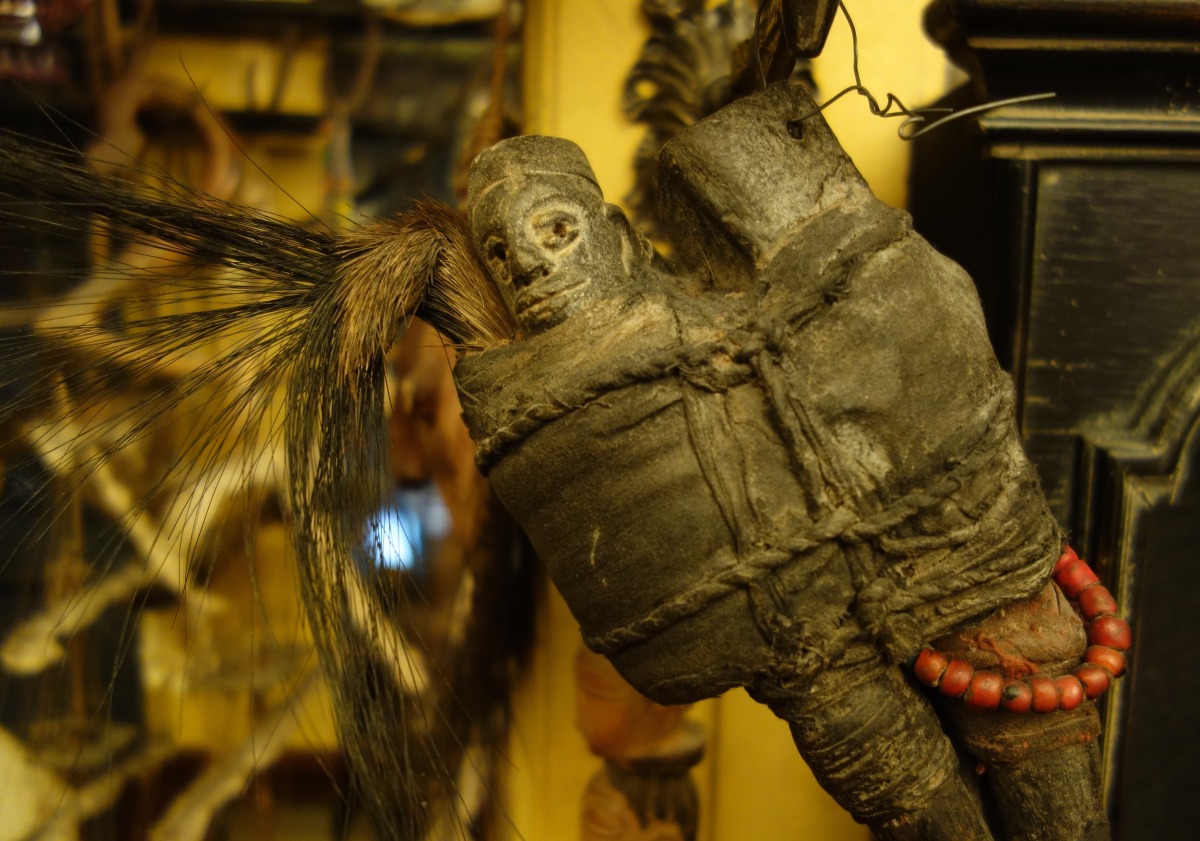 NIGÉRIA. FÉTICHE VAUDOU de trois cornes, crin et perles.