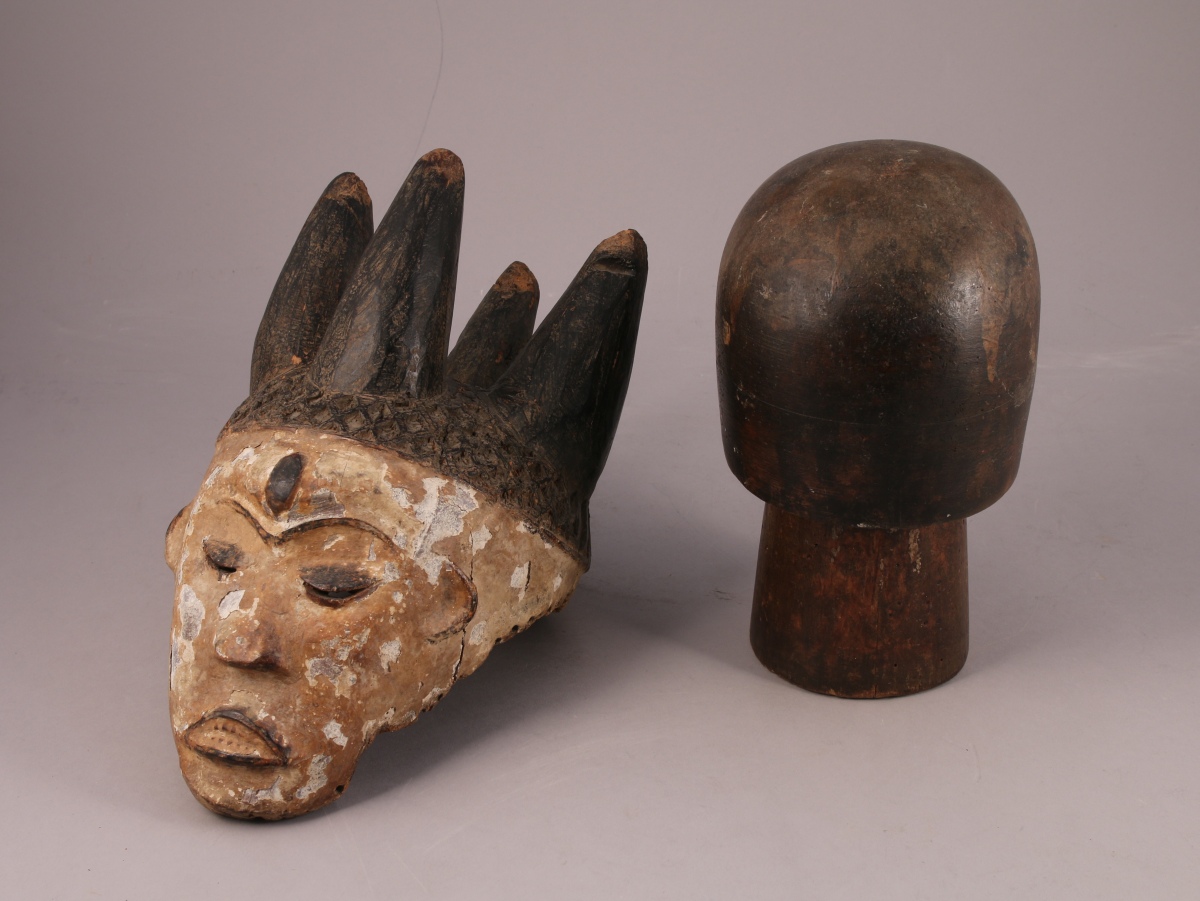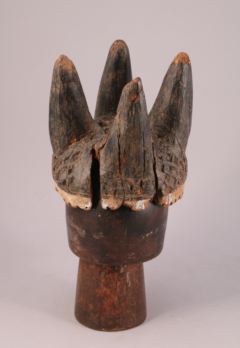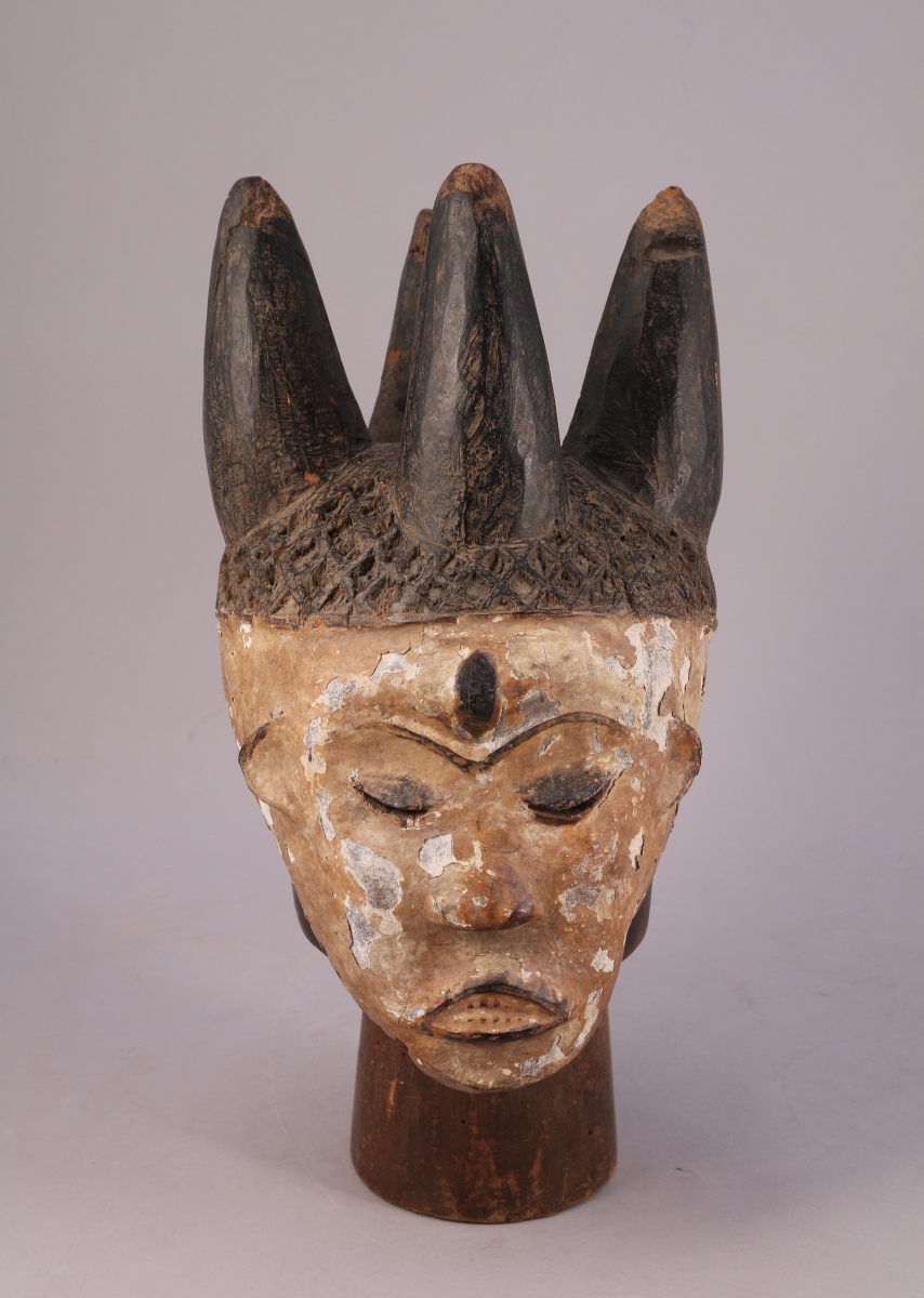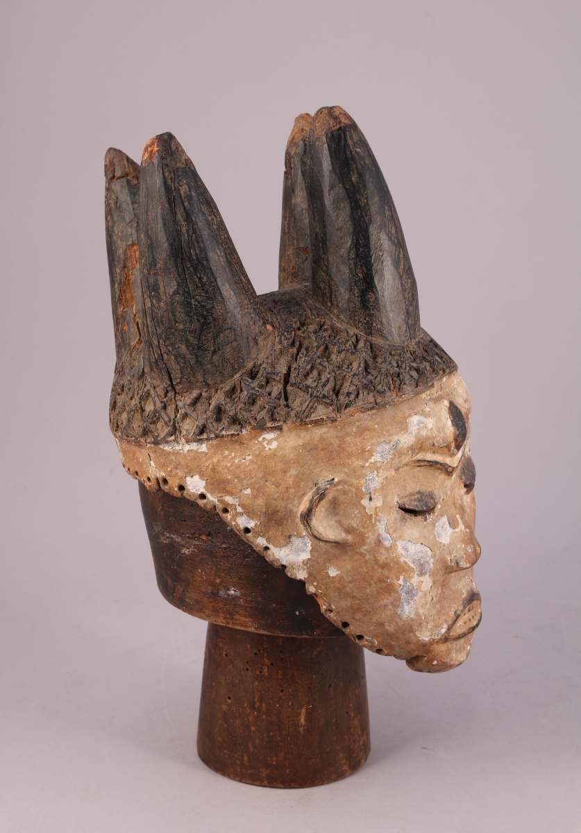 NIGÉRIA - IBO ? MASQUE féminin à quatre cornes de la société MMWO en bois sculpté peint sur kaolin.