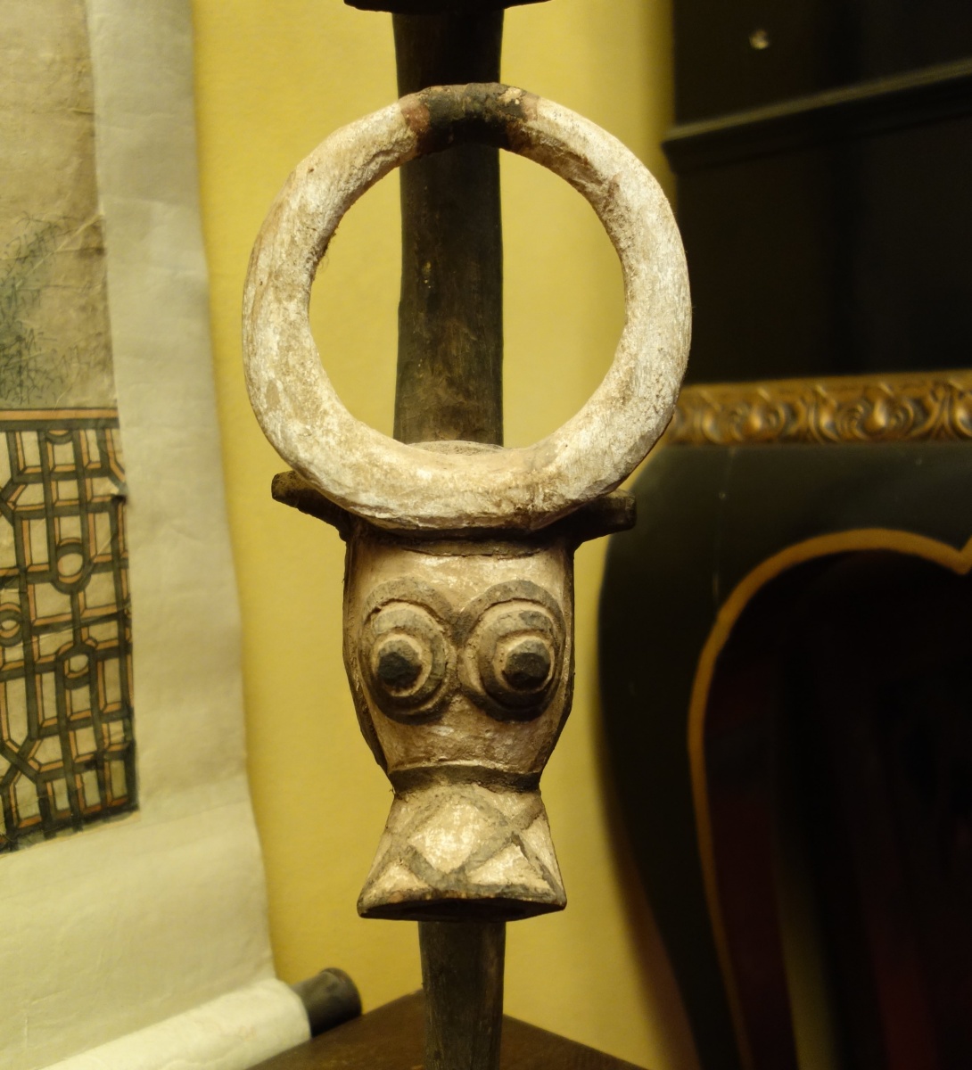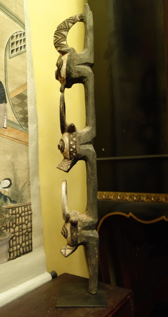 BURKINA-FASO ? TOTEM en bois sculpté de trois têtes.