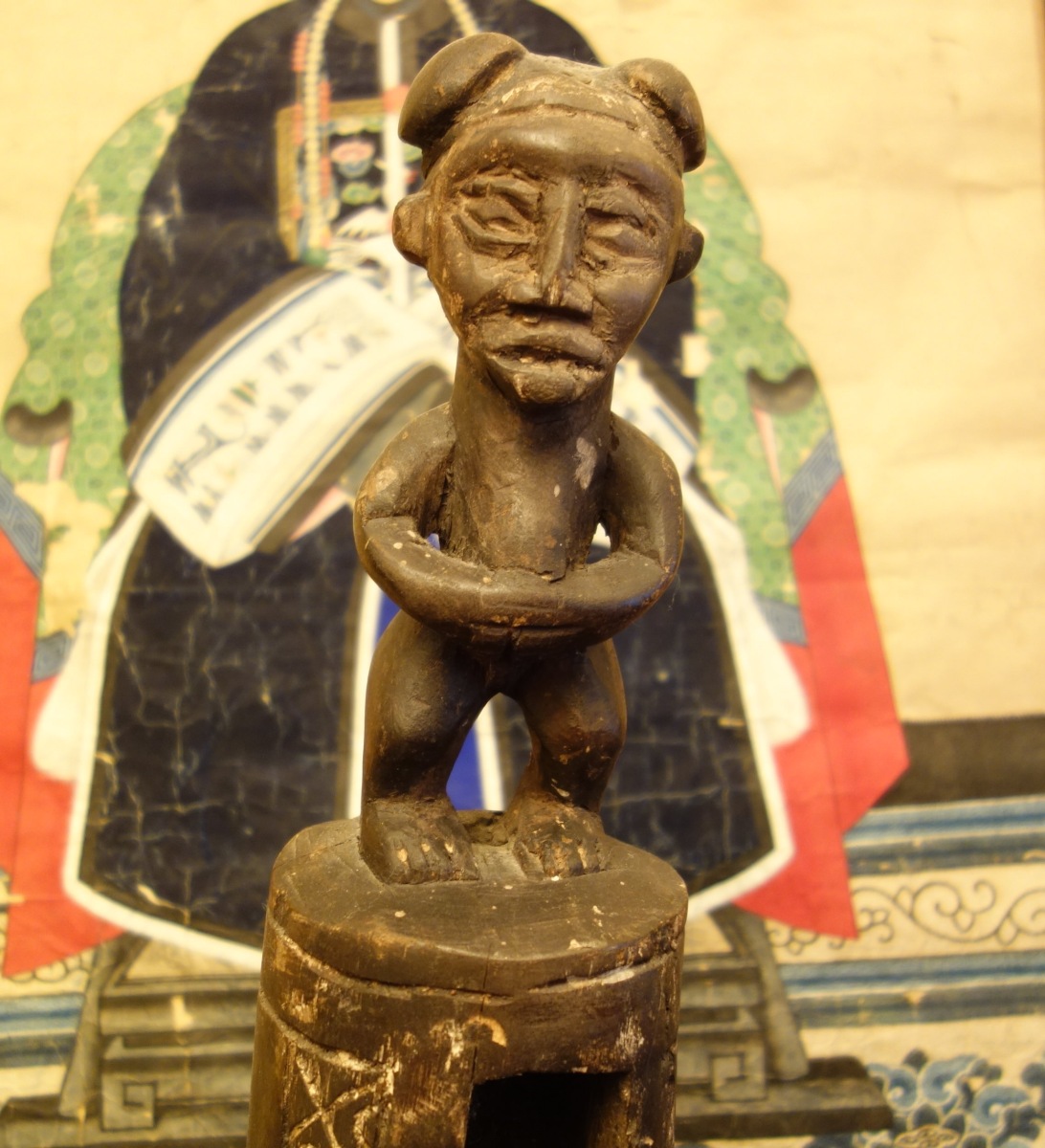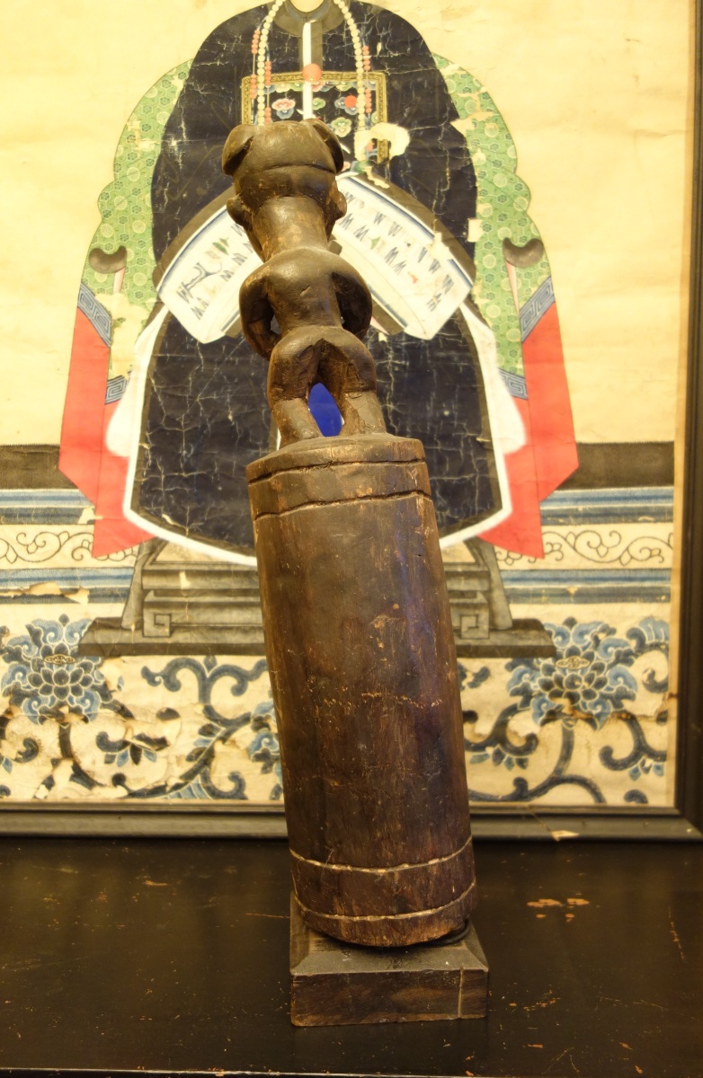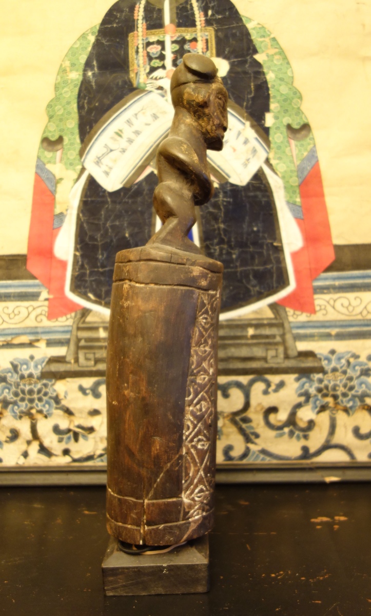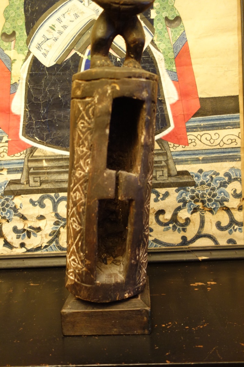 CAMEROUN ? TAMBOUR en bois sculpté sommé d'une figure antropomorphe.