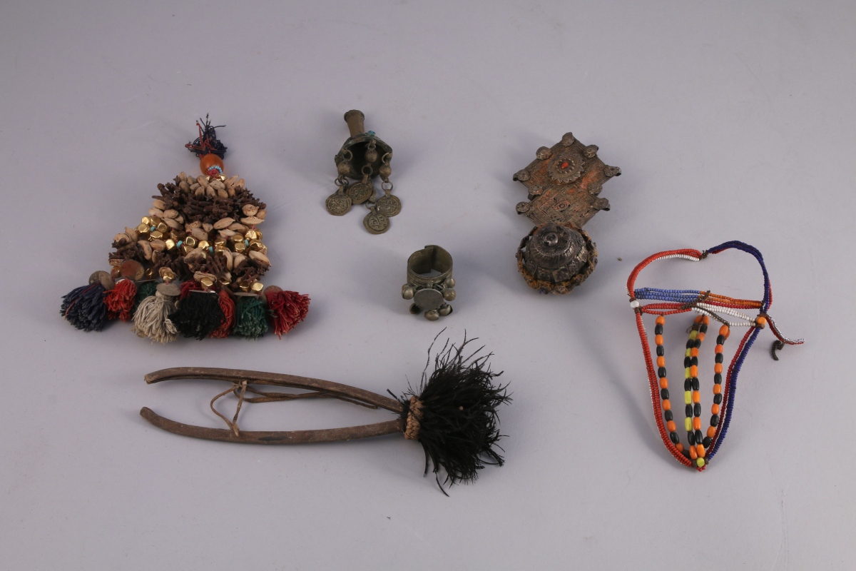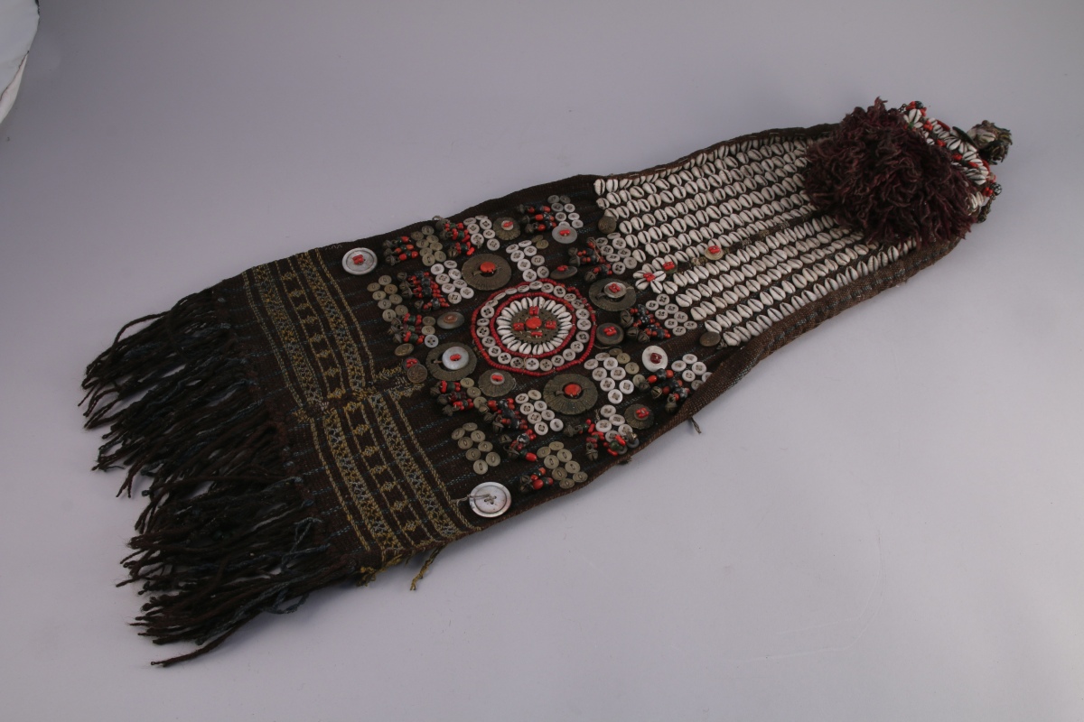 AFRIQUE - XXe. COIFFE en tissu ornée de cauris, boutons, perles de couleurs.