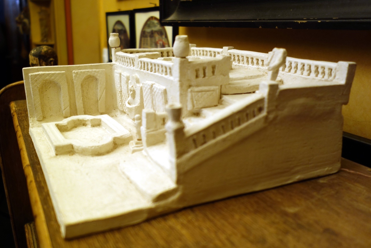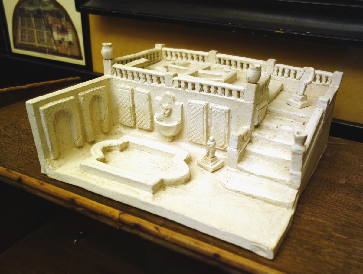 CURIOSITÉ. MAQUETTE de jardin en terrasse en plâtre blanc.