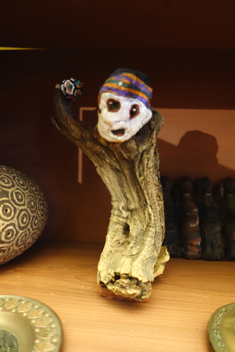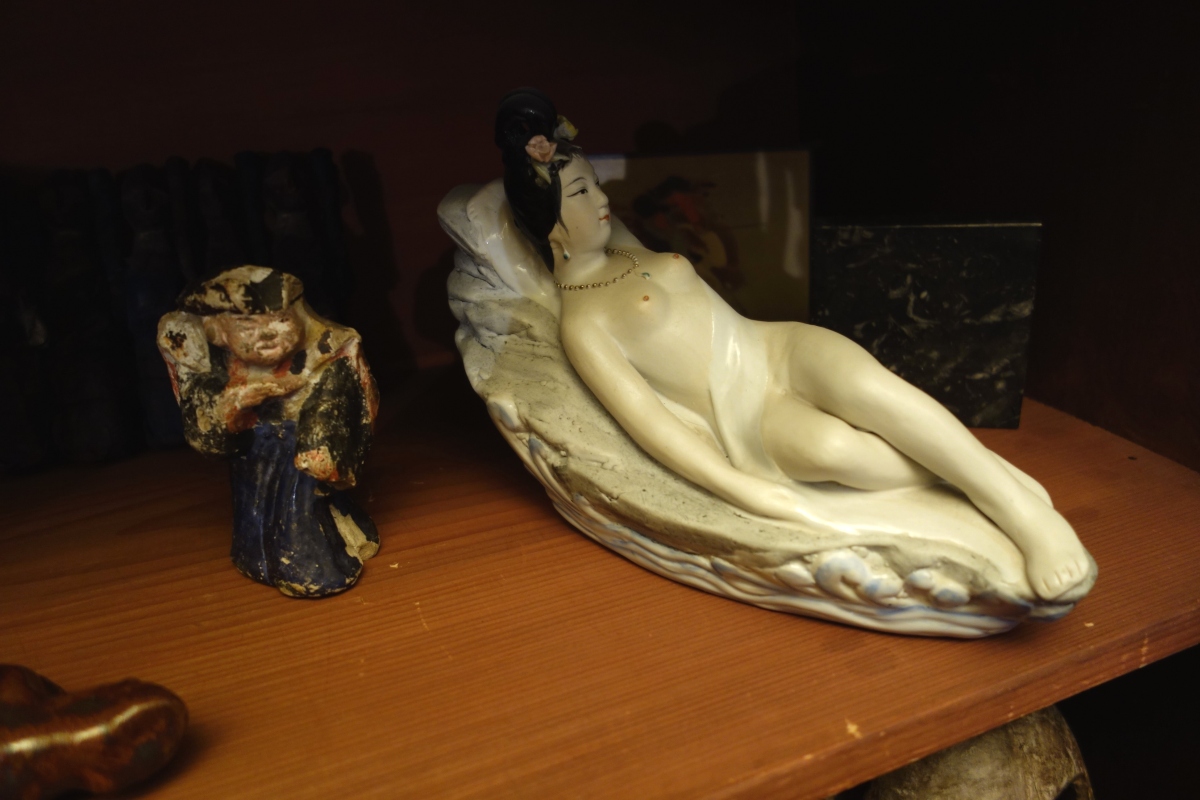 CURIOSITÉ. CONTENU d'une étagère dont : GEISHA en biscuit, CALEBASSE, PIECE métallique de forme circulaire, RACINE détournée et peinte, FRISE de femmes guerrières .
