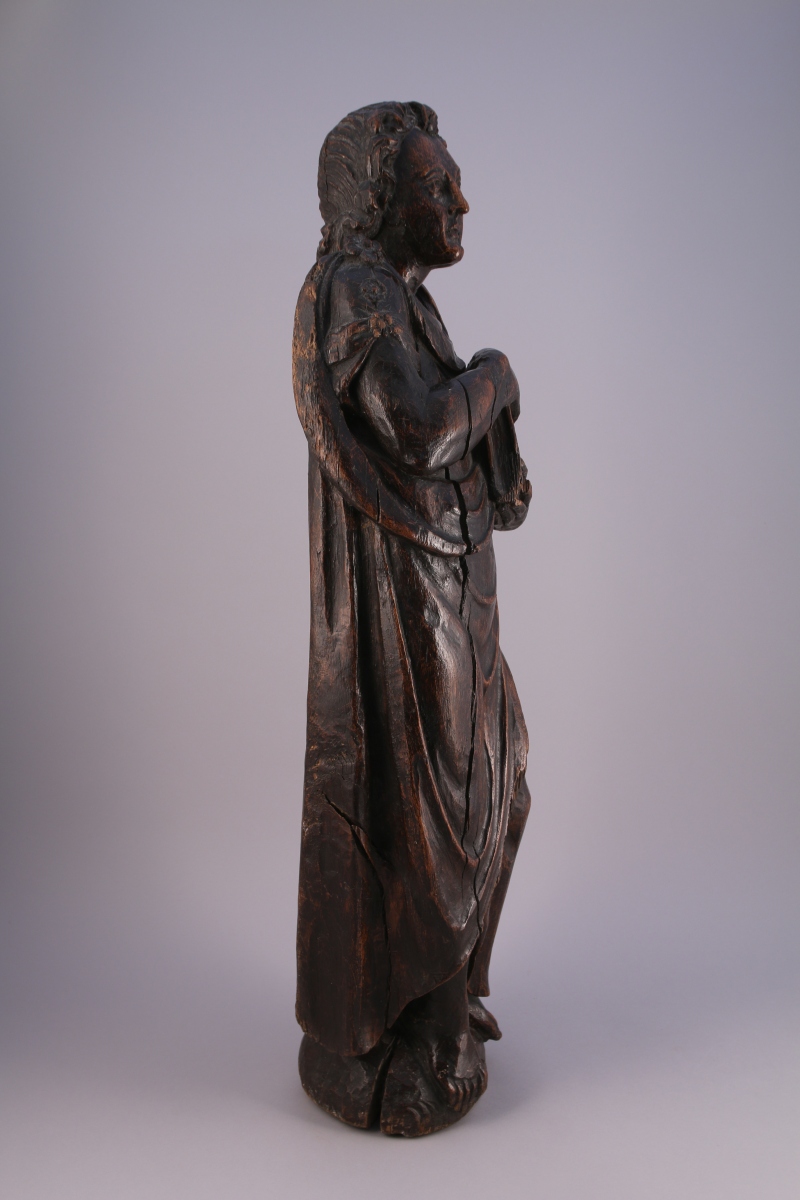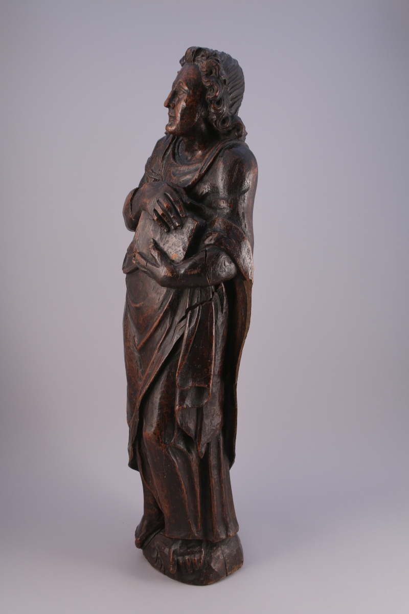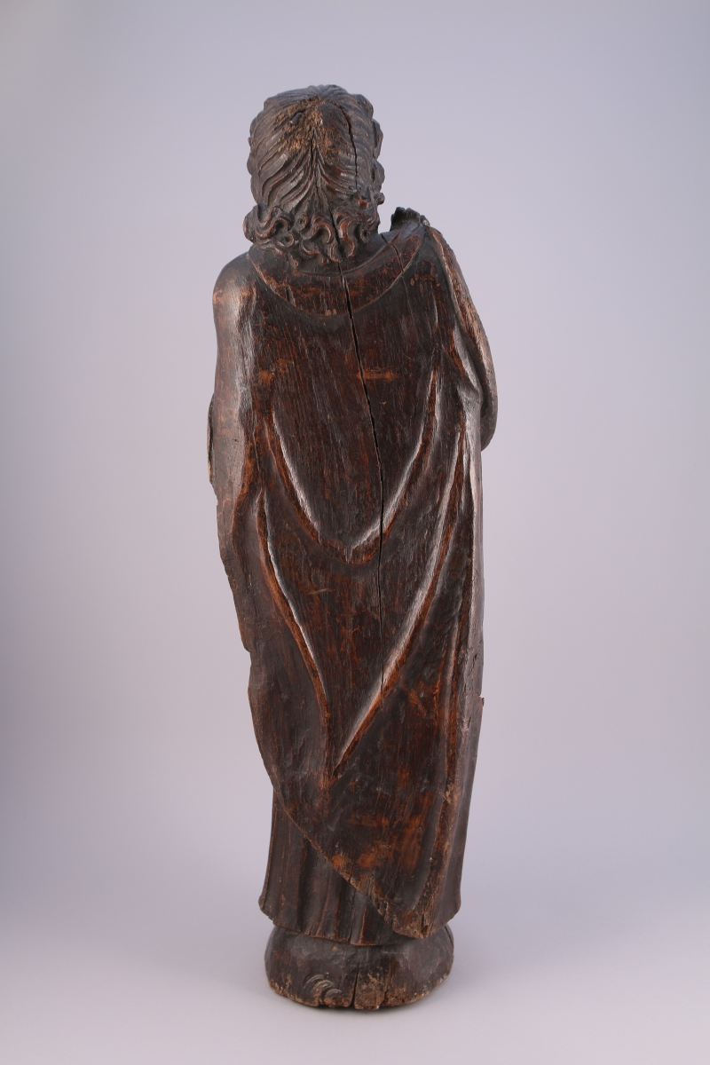 SAINT en bois sculpté et teinté, tenant un livre, vêtu d'une tunique retenue par des trois agraphes-fleurs.