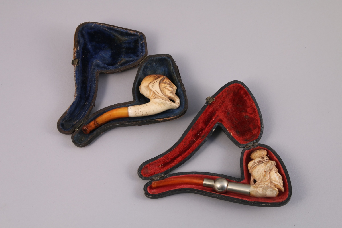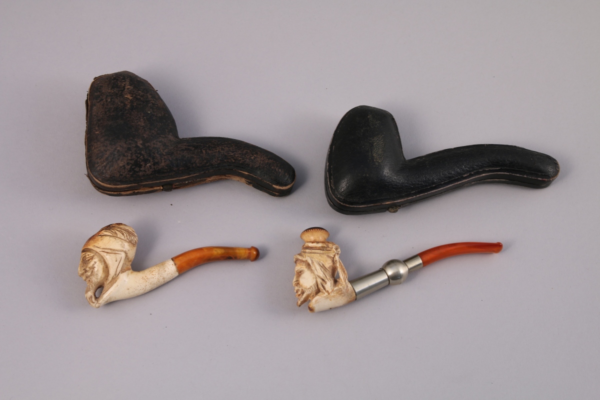 DEUX PIPES sculptées en écume de mer et ambre, l'une figurant un bédouin (Long. 11 cm) dans son étui marqué "Florencio Prats, Calle Jaime 17, Barcelona" , l'autre figurant Lucifer (Long. 9 cm), dans un étui.