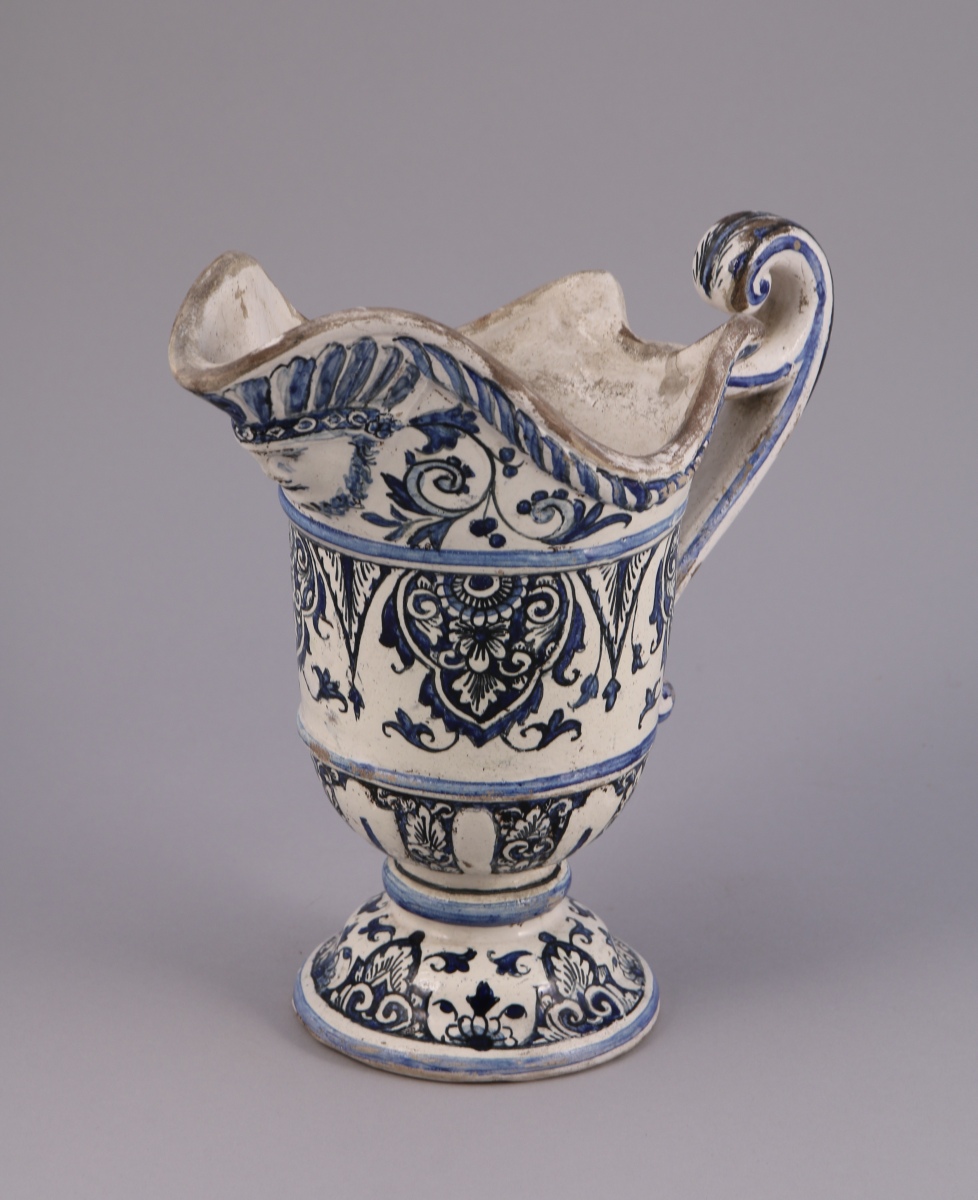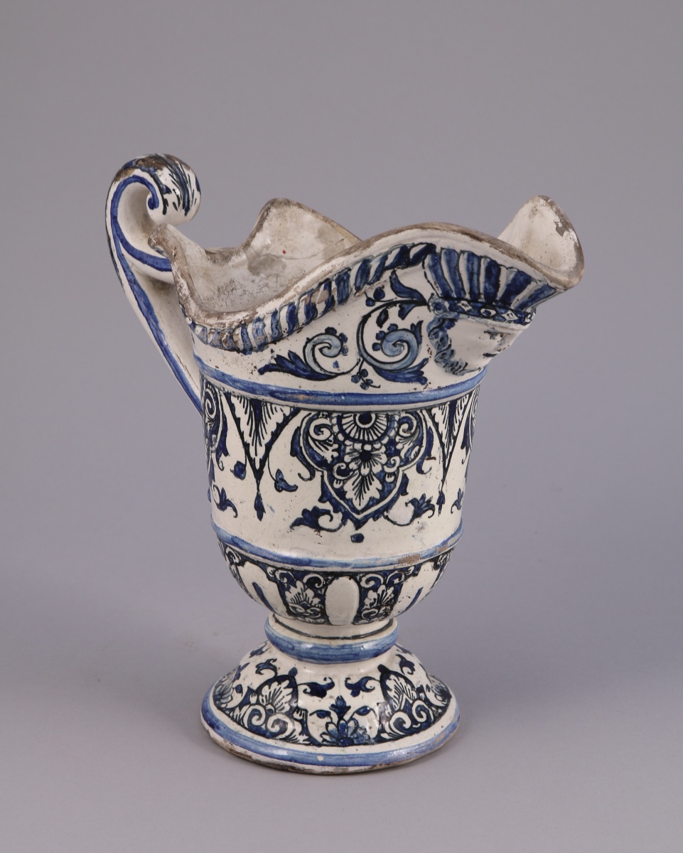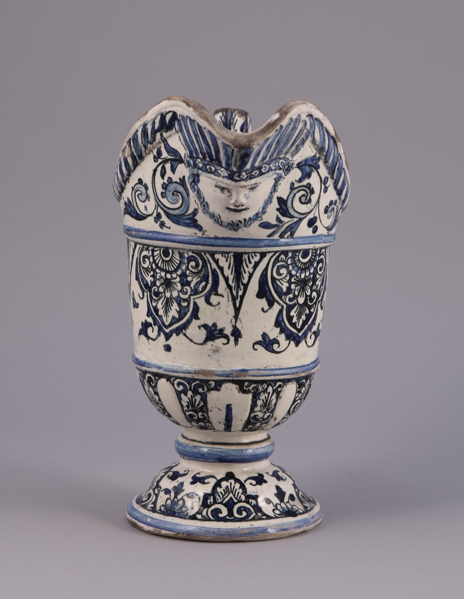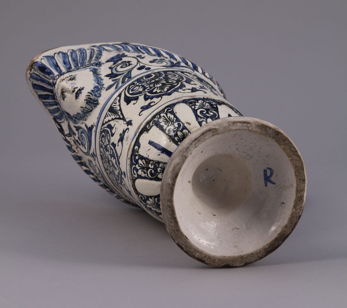 ROUEN. AIGUIÈRE-CASQUE sur piedouche en faïence bleu et blanc à décor de lambrequins fleuris, godrons. Le déversoir orné d'un masque d'homme barbu. Marquée R sous la base.