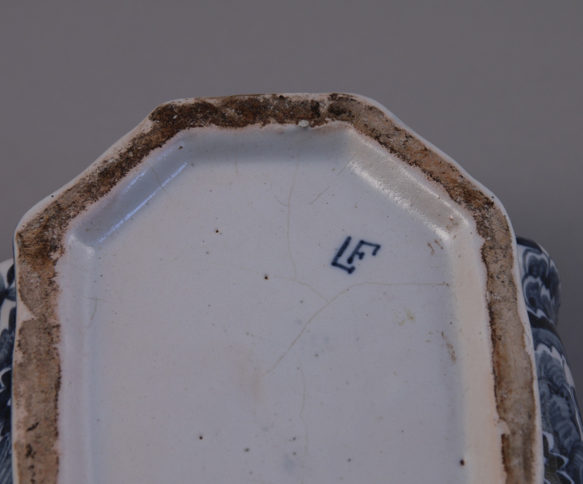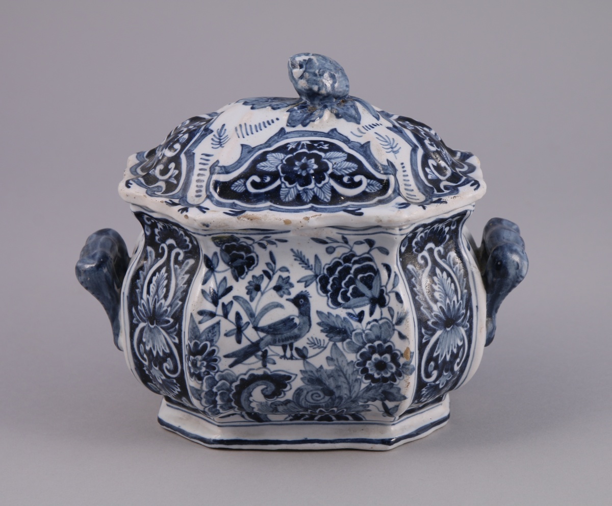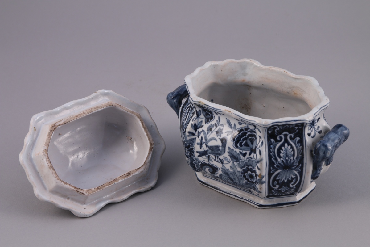 JOINT : SUCRIER genre Delft, couvert à anses en faïence bleu et blanc à décor d'oiseau dans des fleurs. Le frétel en forme de fruit. Marqué LF sous la base. Haut. 14,5 cm. (éclats à l'émail).