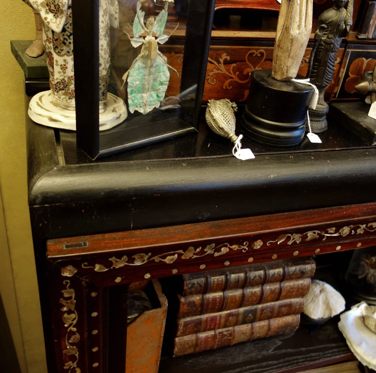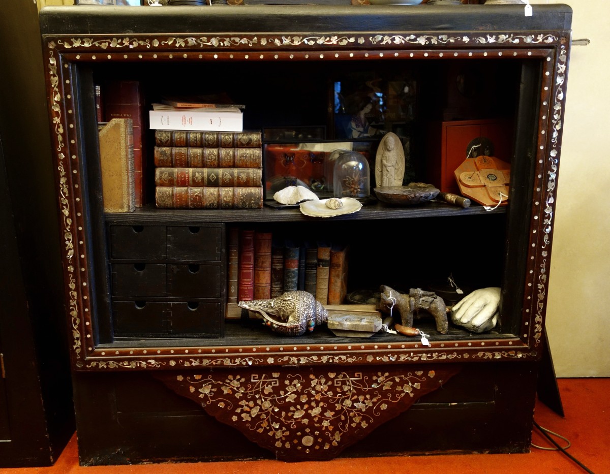 BAHUT de forme rectangulaire en bois noirci, les montants en doucine inversé, ouvrant par une grande niche avec un encadrement en bois de fer ( ?) finement marqueté de feuillages nacrés.