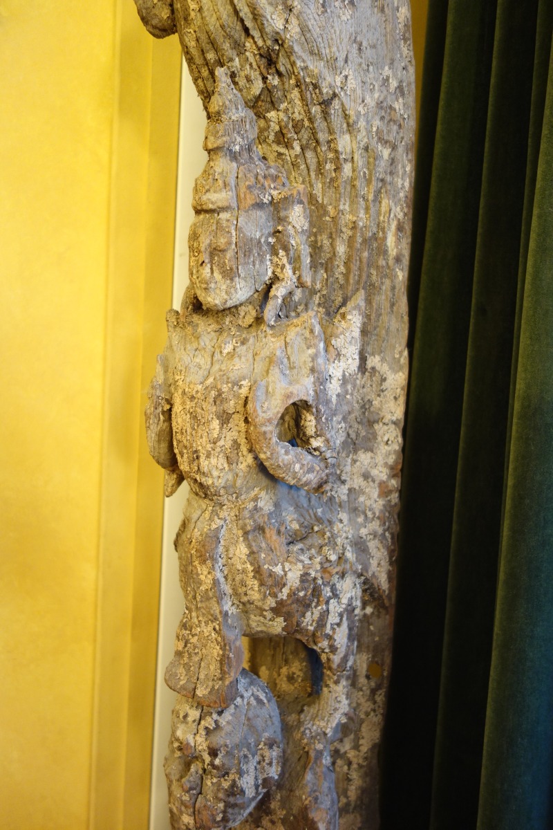 BIRMANIE - SHAN - XVIIe. SCULPTURE SHAN KINNARI figurant l'oiseau sacré au buste et visage féminin (Garuda) posé sur les épaules du roi des singes (Hannuman) en bois de teck sculpté.