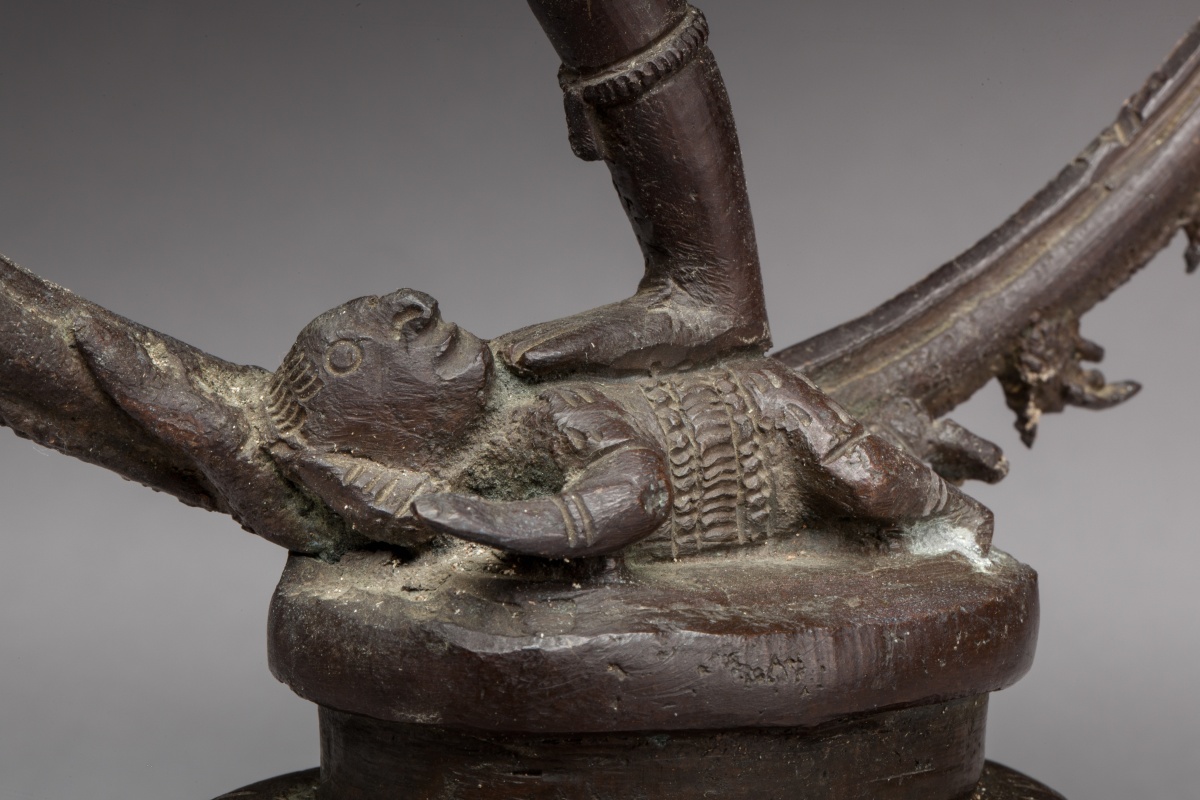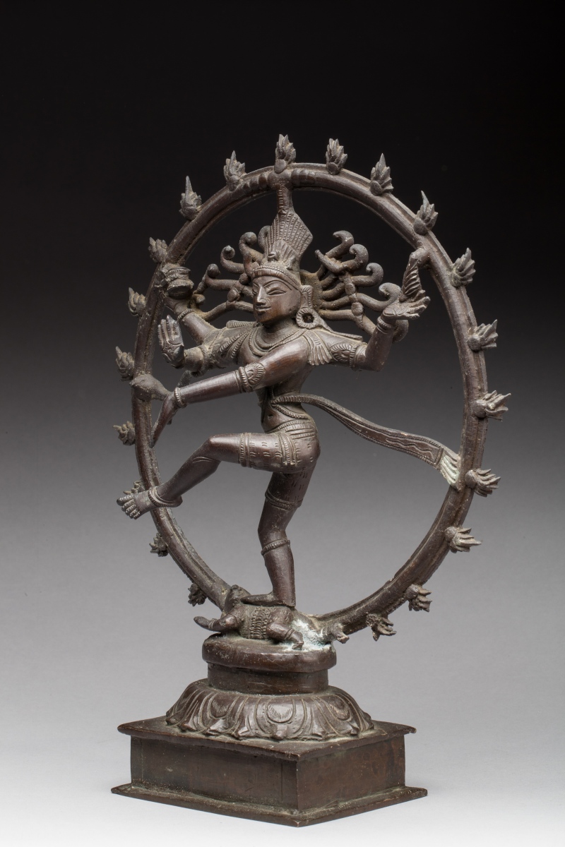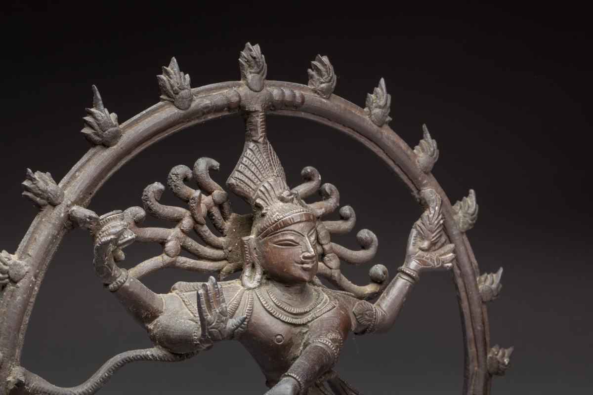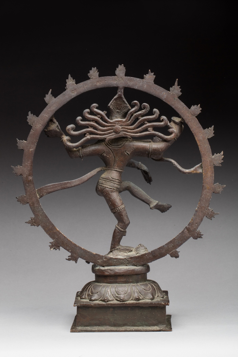 INDE, XIXe. Statue de SHIVA dansant dans un cercle de flammes. Elle repose sur un socle.