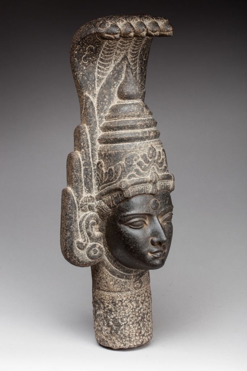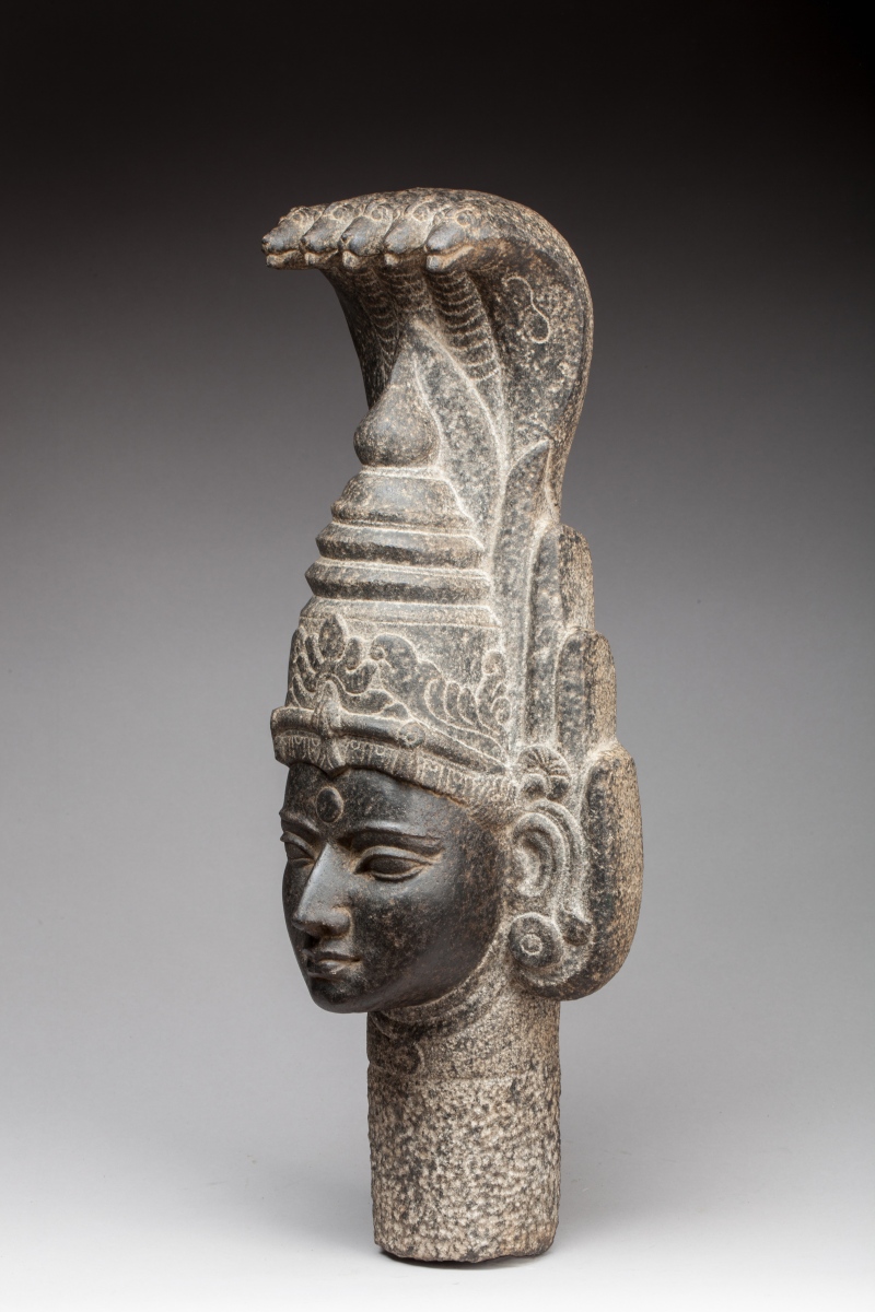 Rare représentation de la déesse serpent (nâgî) " Née de l'esprit ", mère de tous les serpents et fille de Kasyapa leur roi. La vision de dos permet d'observer son corps ondulant s'achevant en un capuchon déployé marqué de cinq têtes de cobras venant abriter la face principale anthropomorphe (ici surdimensionnée) de la divinité.