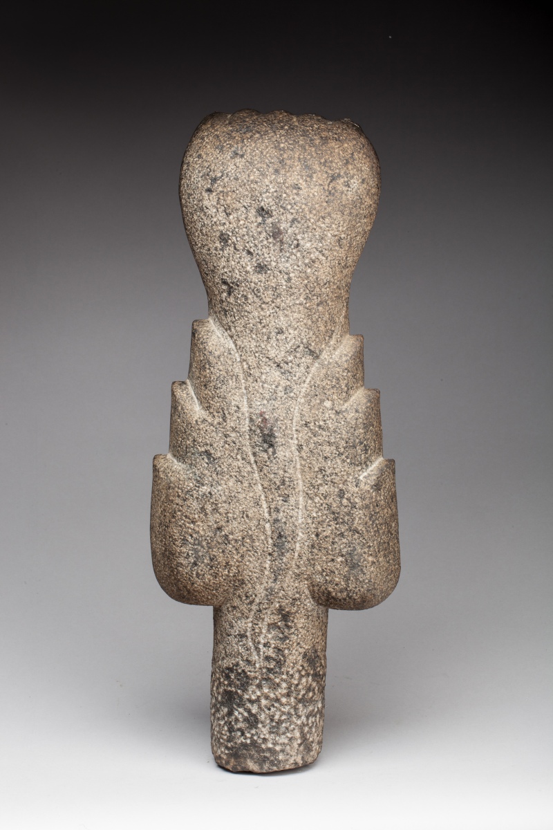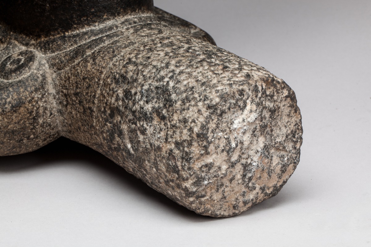 La partie inférieure, circulaire et moins soignée, indique que cette œuvre se trouvait initialement dans son contexte sacré, fichée sur une base lui étant rituellement associée, à l'instar des Shiva liñga et des yoni.
