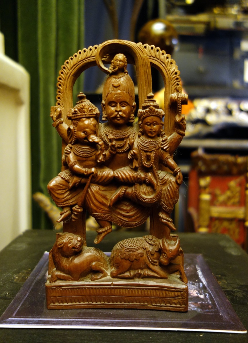 INDE. SHIVA, PARVATI et GANESH en bois sculpté.
