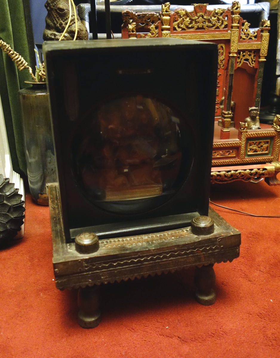 Haut. 18, Larg. 10 cm. Présentée dans un amusant cube orné, d'un hublot sur un tabouret en bois tourné. Haut. totale 45 cm.