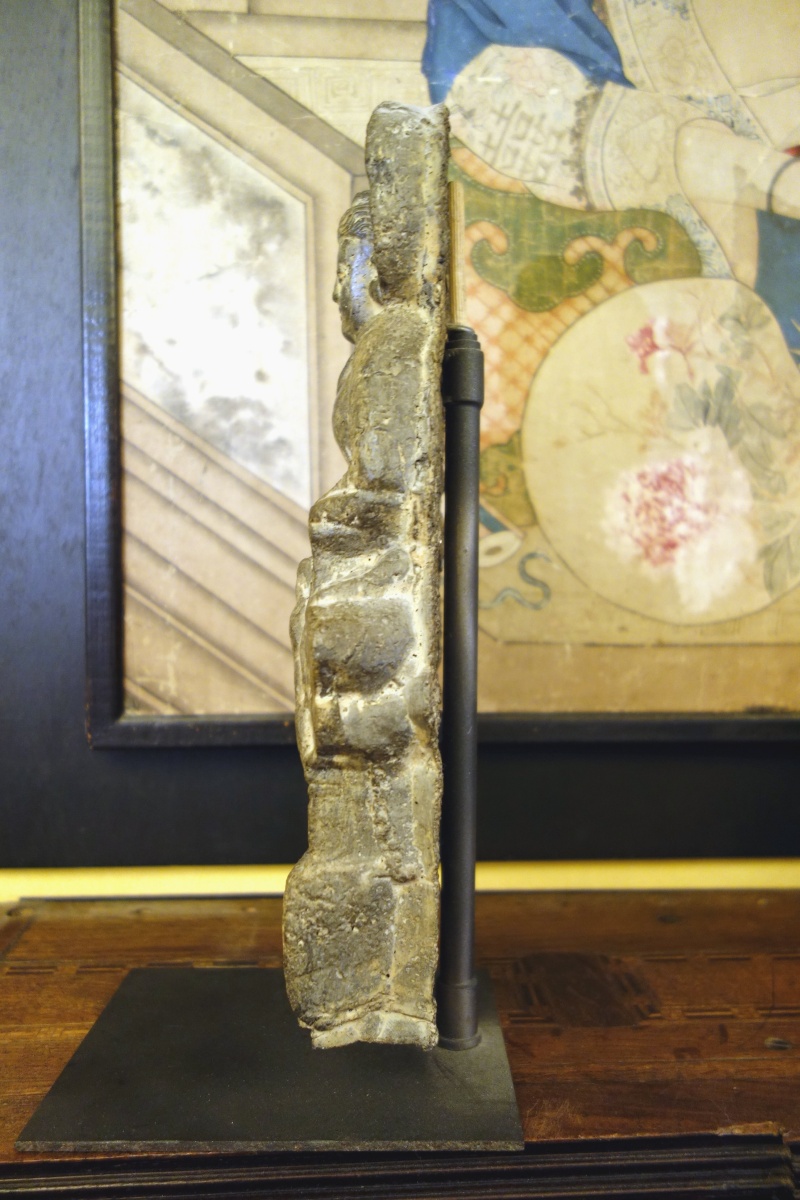 GANDHARA. BUDDHA bas-relief en schiste gris, faisant le geste de l'absence de crainte (abhaya-mudra).