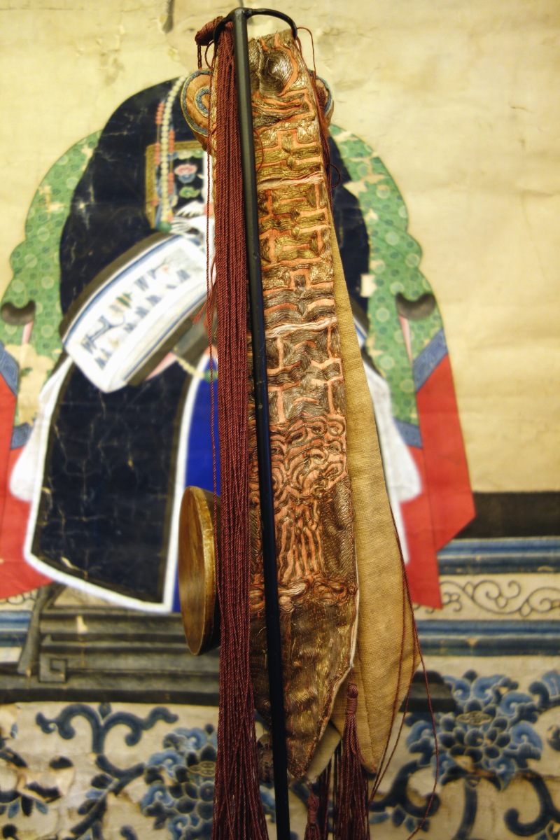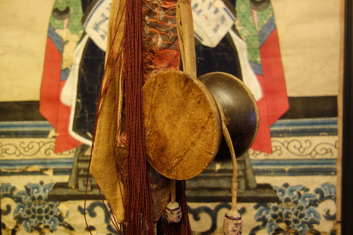 TIBET ? TAMBOURIN rituel, bois, peau et une ceinture en soie tressée d'idéogrammes avec des fils d'or. Monté sur un socle.