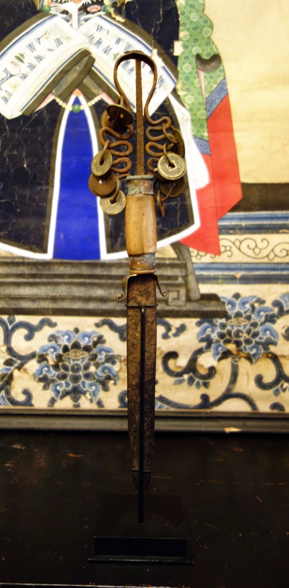 TIBET ? POIGNARD, la poignée ornementée de pièces trouées.