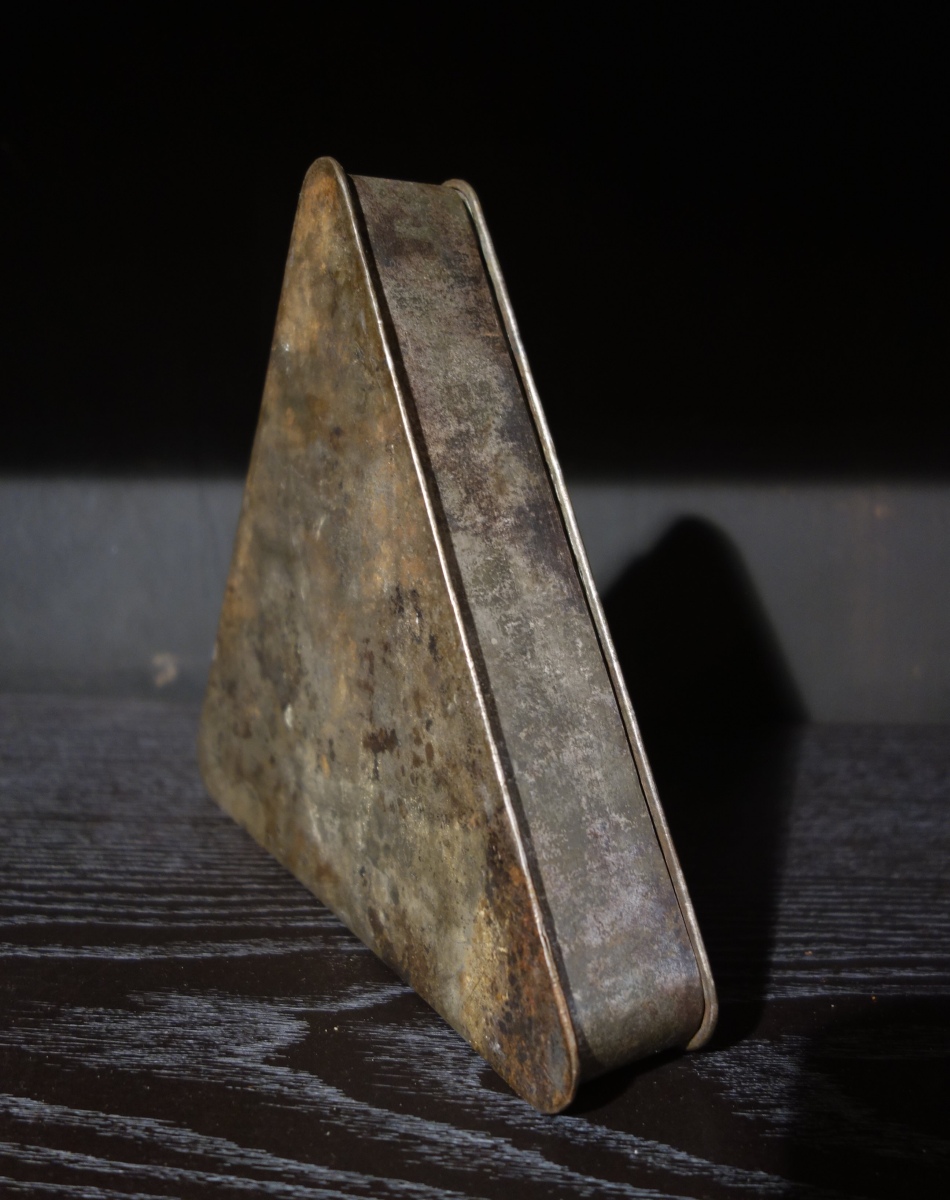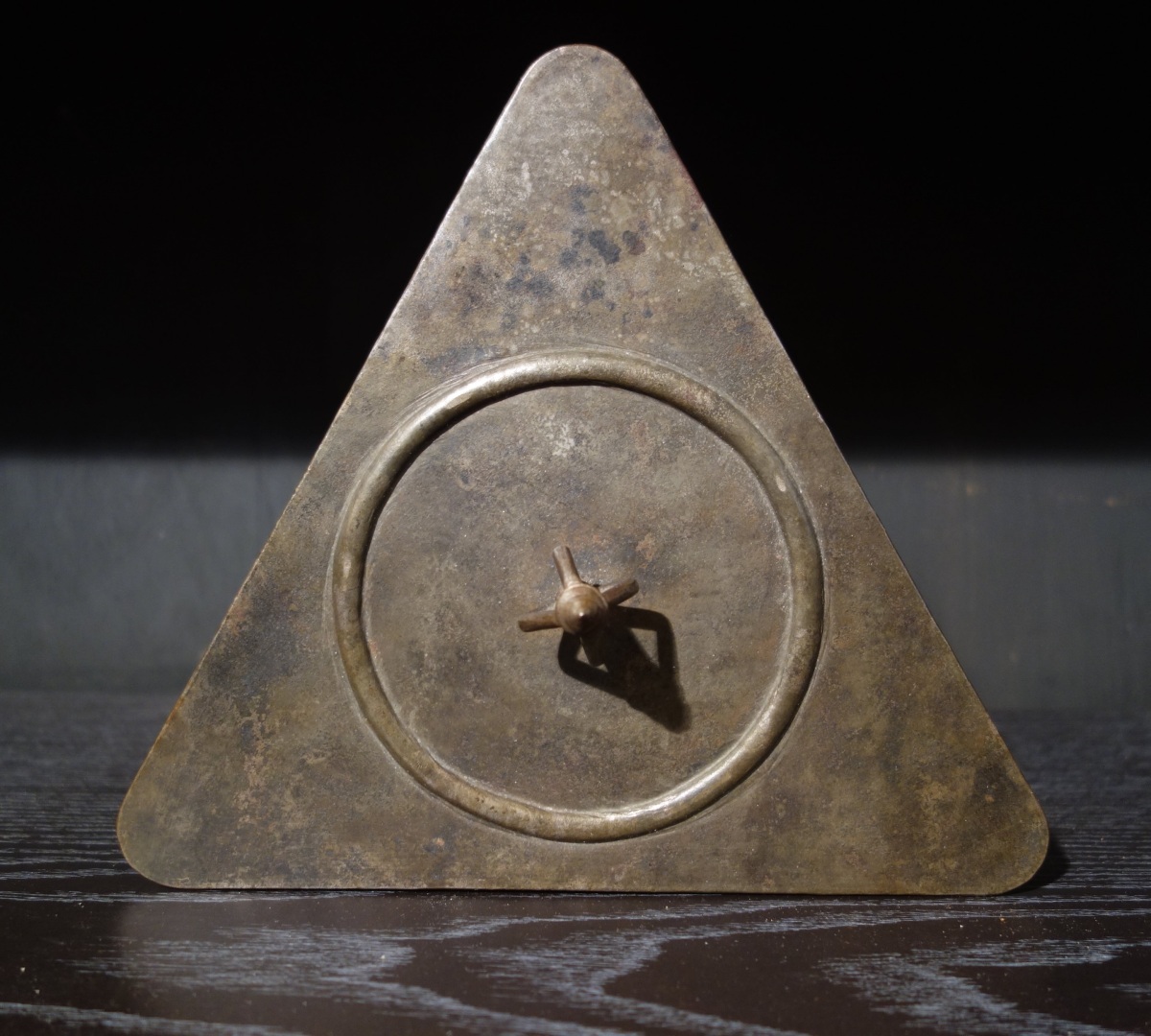 TIBET - XVIe ? BOITE TANTRIQUE de forme triangulaire en métal avec ses accessoires rituels, haches, pointes en fer.