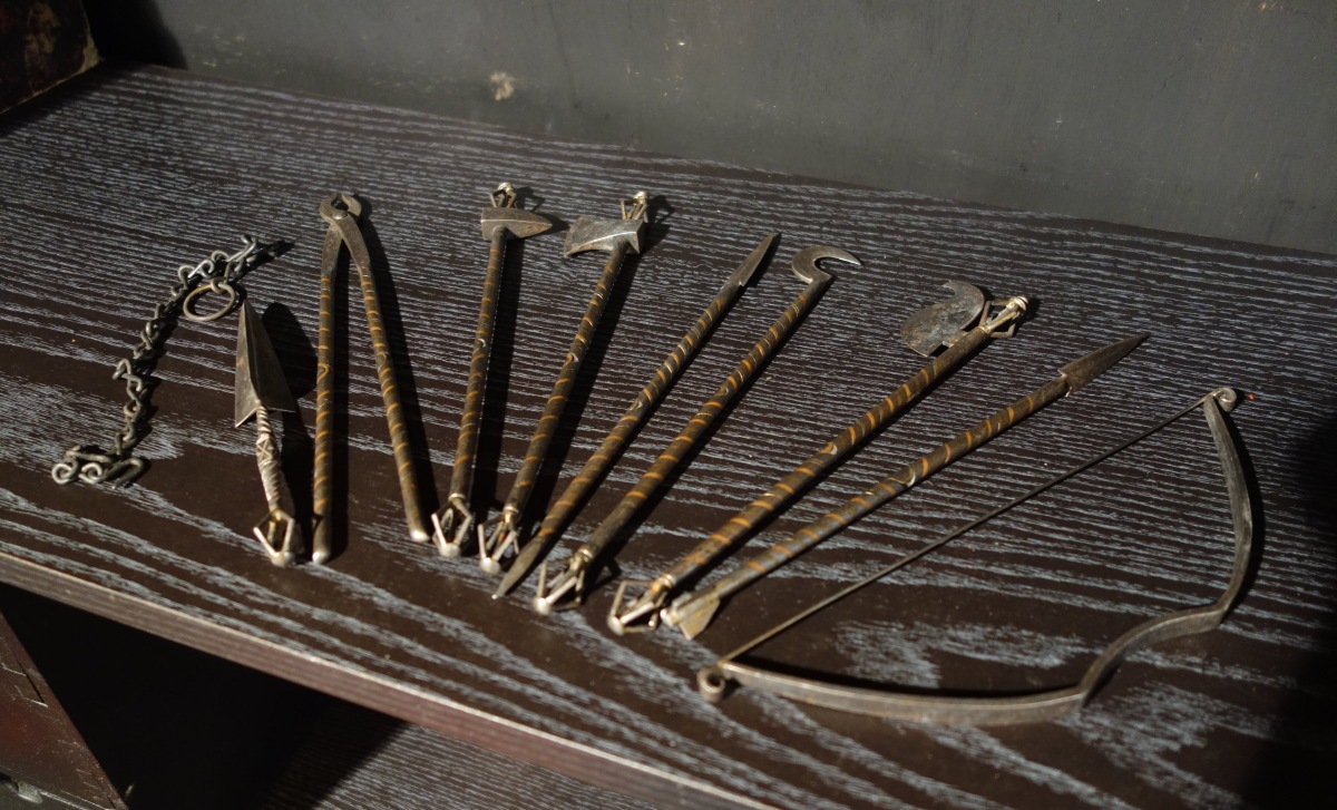 Ces objets rituels sont utilisés durant la cérémonie d'accompagnement vers la mort. Ils sont les attributs de Mahakala, une des formes de Shiva aux multiples bras,