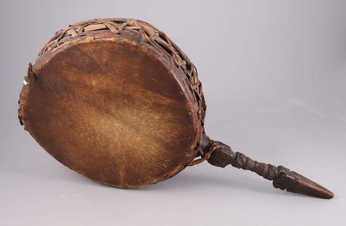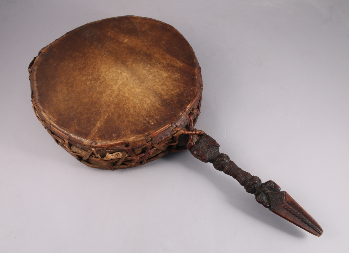 NÉPAL. TAMBOUR de CHAMAN en bois sculpté et cuir. La...