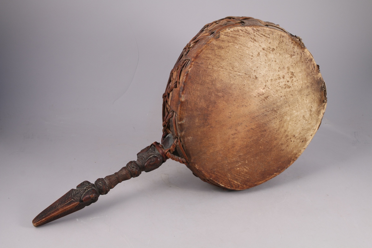 NÉPAL. TAMBOUR de CHAMAN en bois sculpté et cuir. La dague ornée de masques et motifs géométriques.