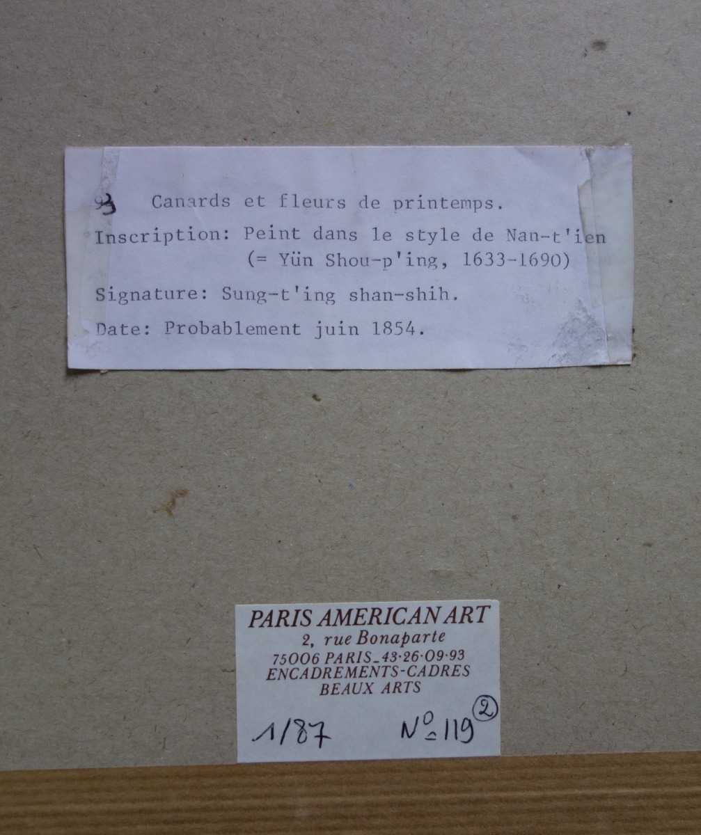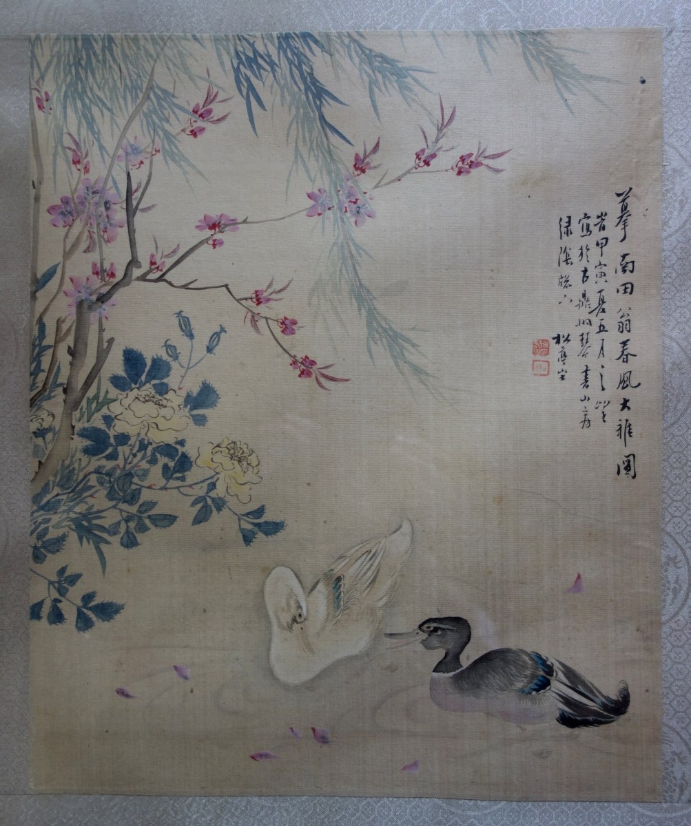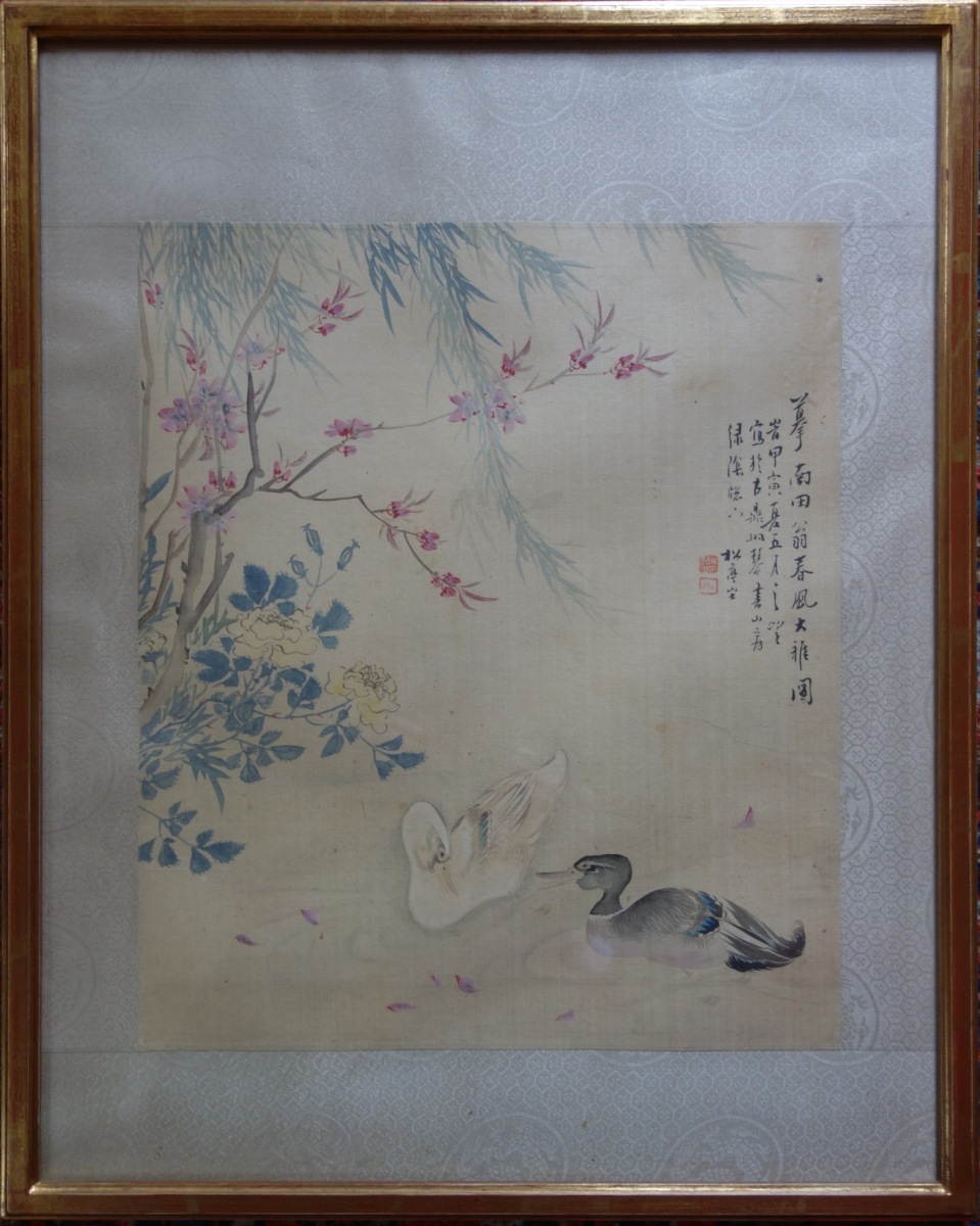 CHINE - XXe. Deux ENCRES : une représentant un oiseau perché sur une branche de saule pleureur sur papier; l'autre représentant deux canards nageant dans l'eau, entourés de fleurs sur soie.
