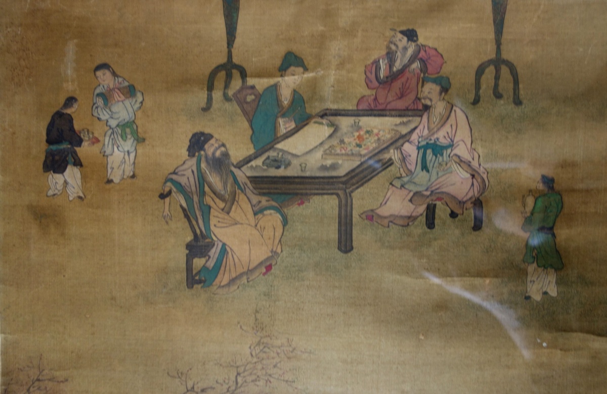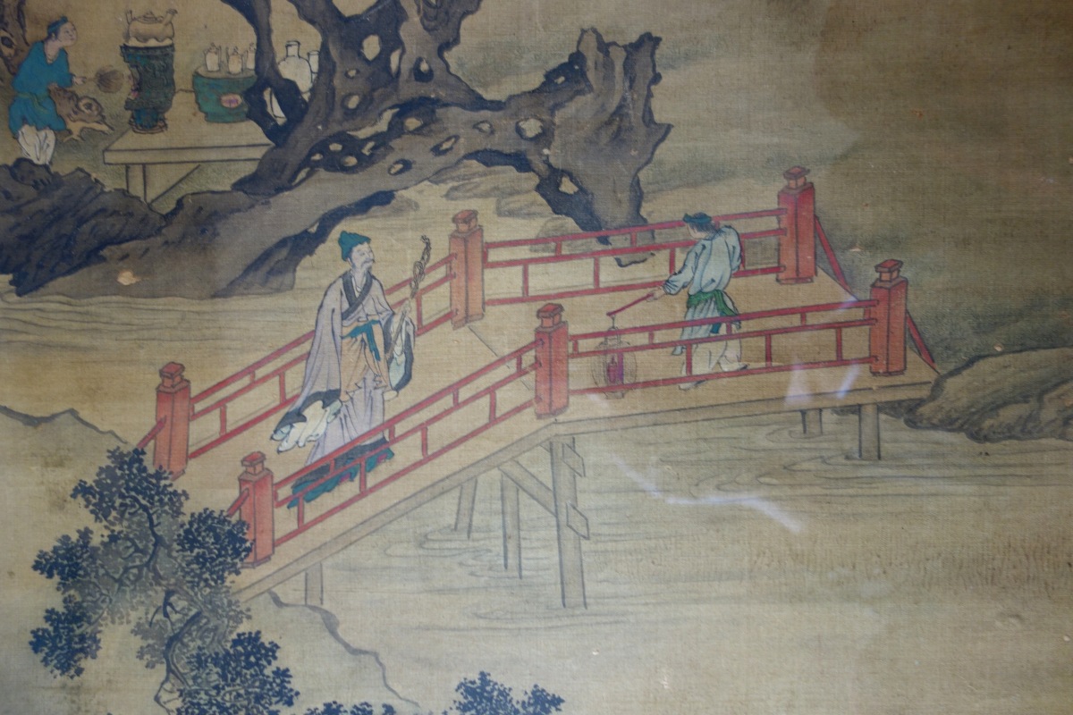 CHINE - XXe. Encre et couleur sur soie, représentant des lettrés dans un jardin avec leurs serviteurs.