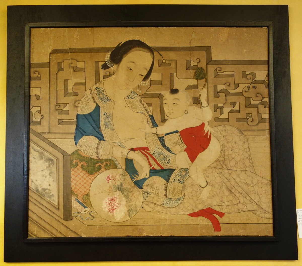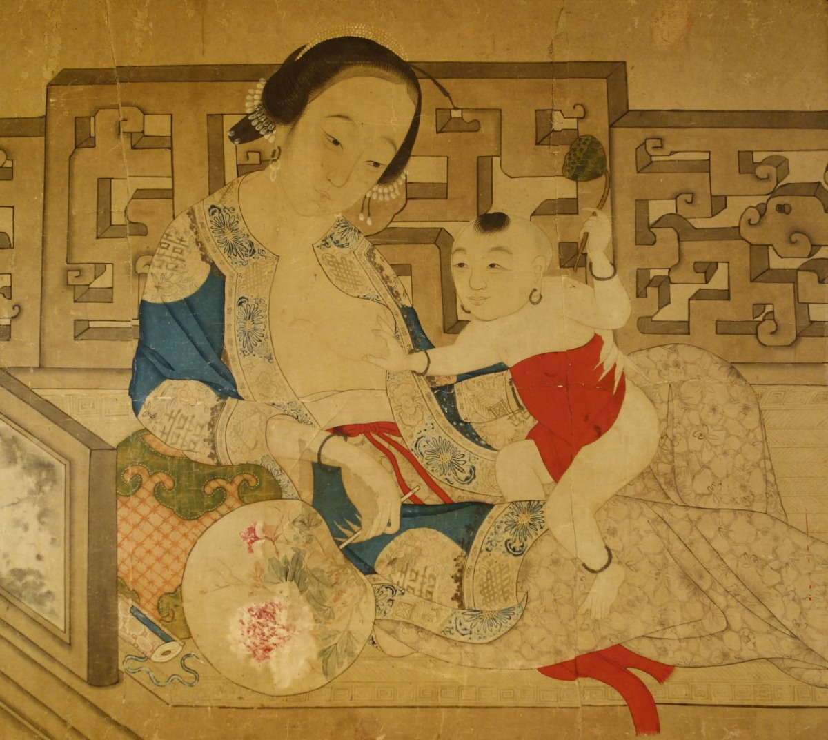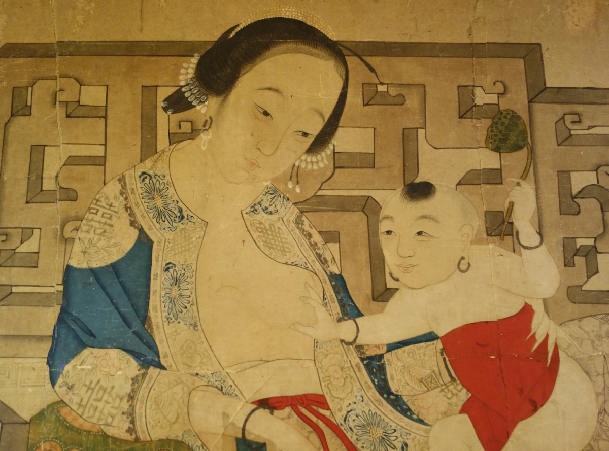 CHINE - Début XIXe. Encre et couleurs, femme allaitant.