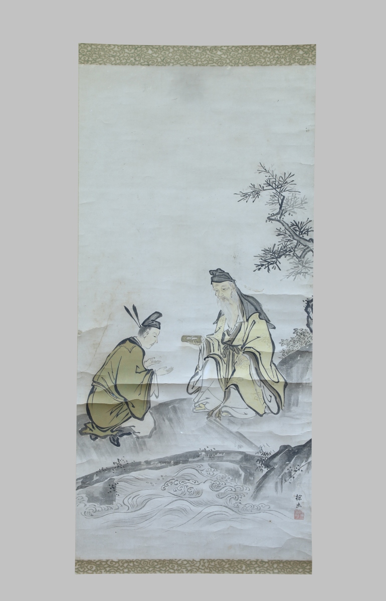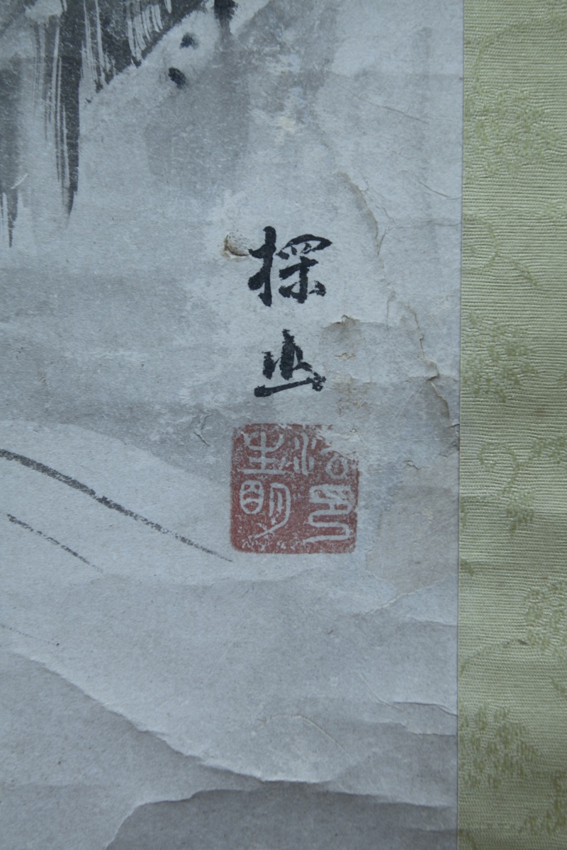 CHINE. PEINTURE à l'encre de Chine, figurant la remise d'un rouleau entre deux lettrés dans un paysage. Cachet et caractères en bas à droite.