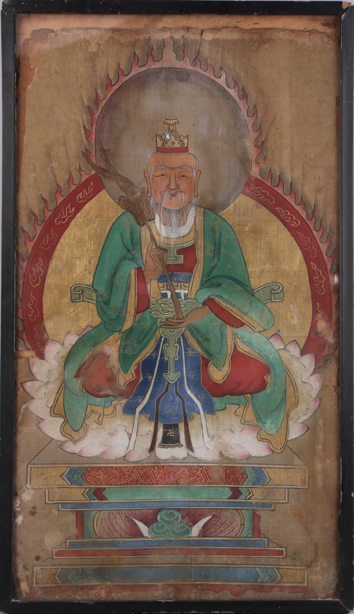 CHINE - XIXe ? PEINTURE sur soie marouflée figurant une divinité masculine tenant un chasse-mouche, assise sur un lotus épanoui, dans une mandorle.