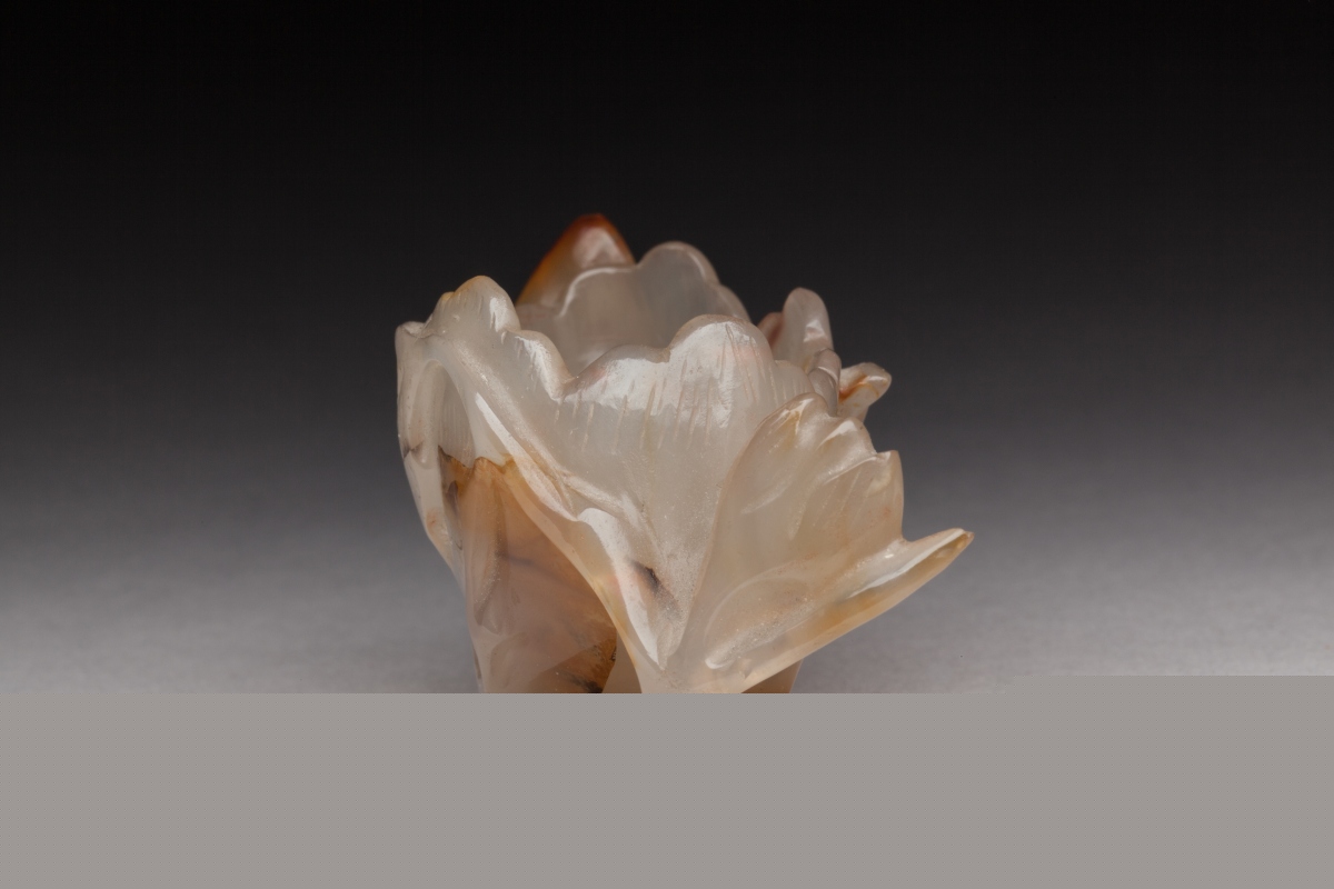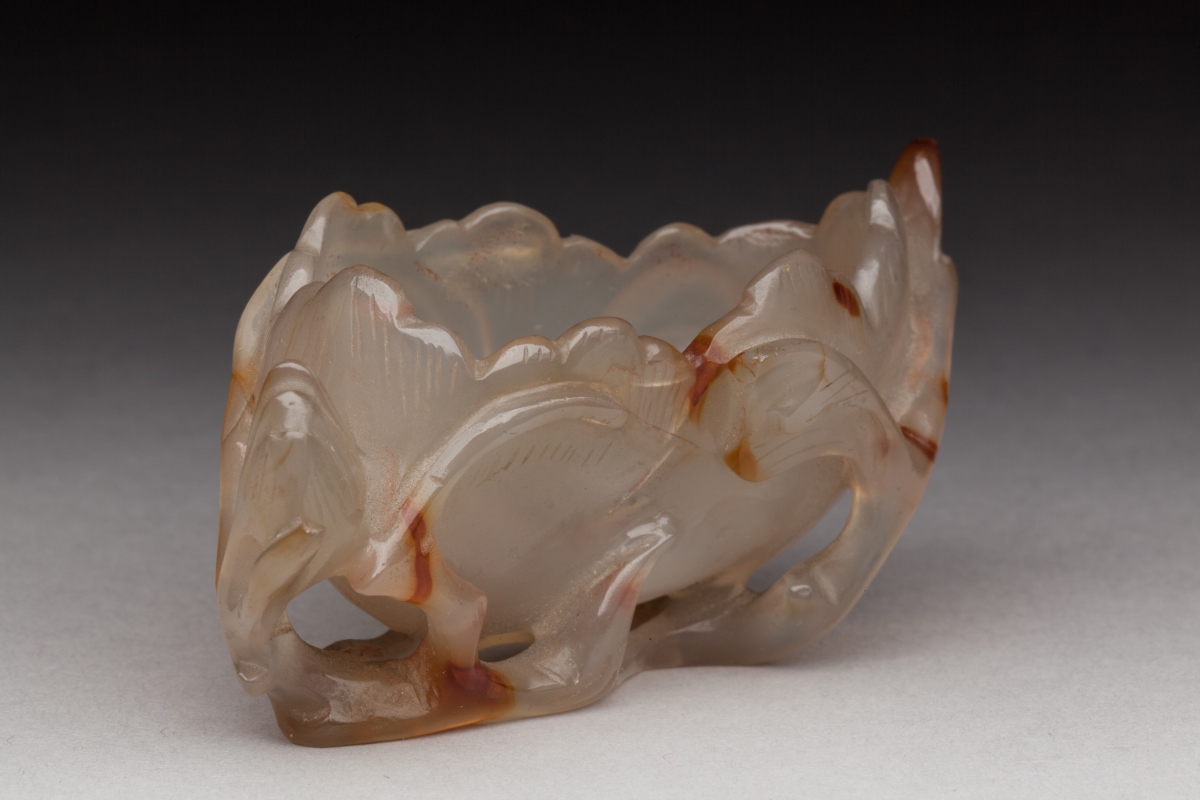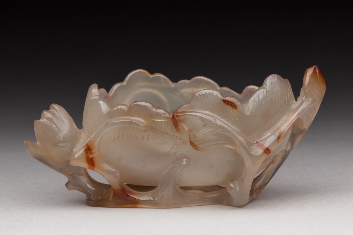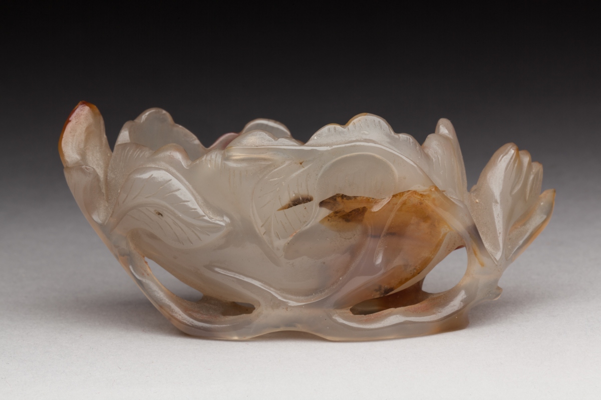 CHINE - Début XXe. Petite COUPE en agate grise et brune en forme de feuille de lotus et sculptée en relief et détachée de feuillage.