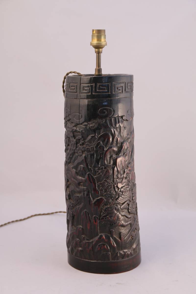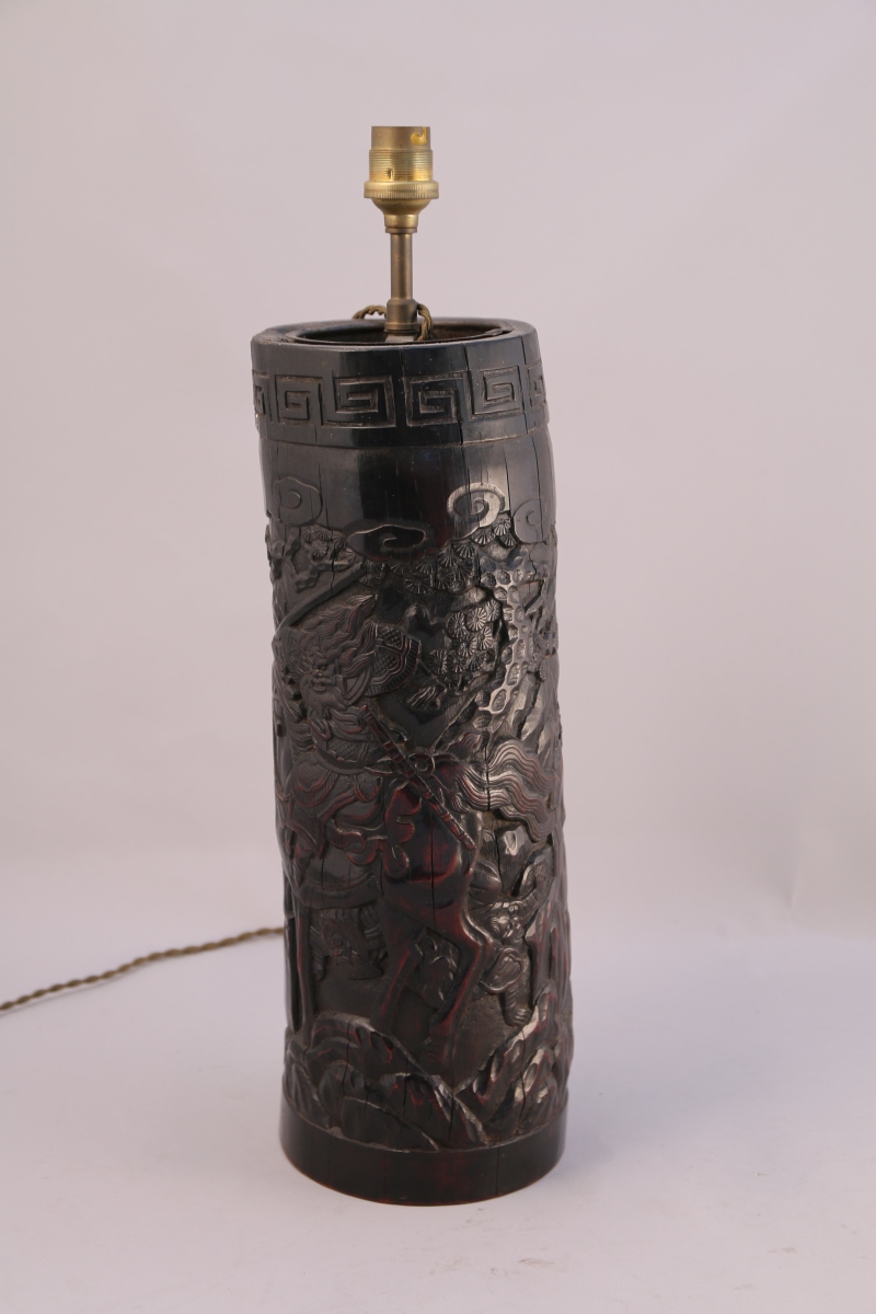 CHINE - Début XXe. PORTE-PINCEAUX en bambou sculpté d'une scène représentant Zhong Kui chassant des démons. (Electrifié). Haut. 36 cm.