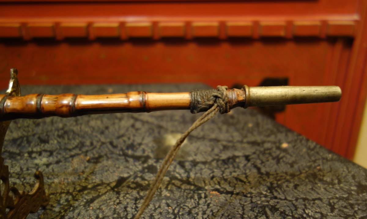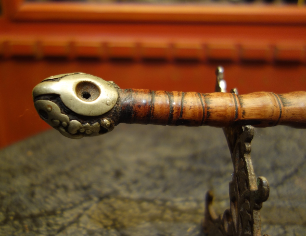 CHINE. PIPE à OPIUM en bambou noueux et métal à la façon d'un corps de serpent, avec un étui à opium en cuir en forme de fleurs de pavot.