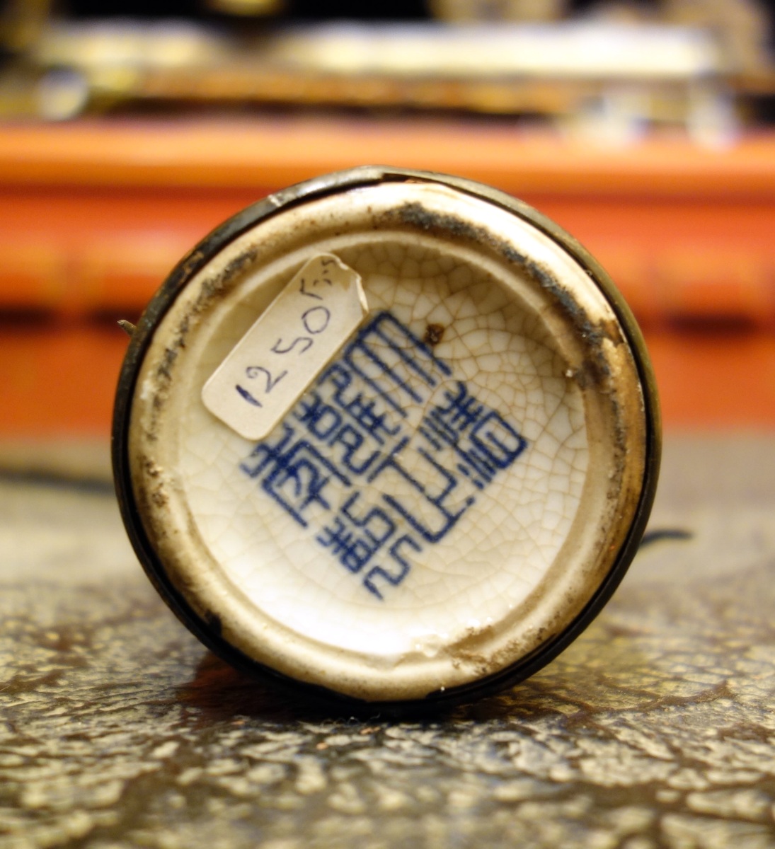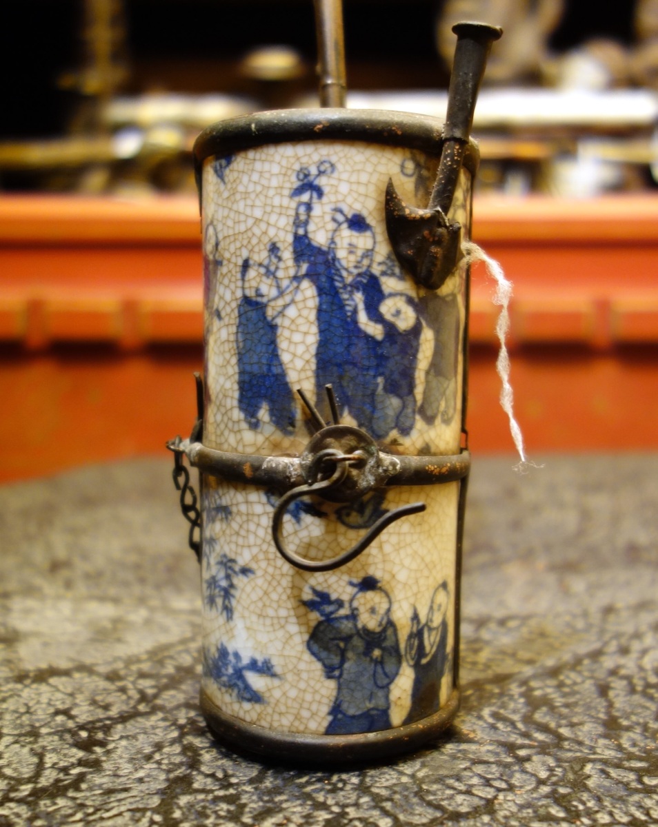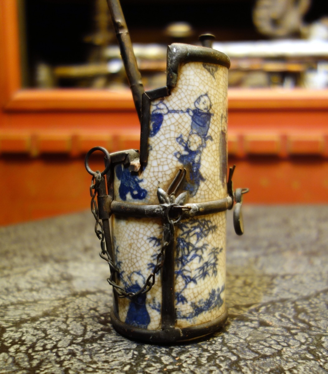 CHINE. PIPE en porcelaine à décor en camaïeu de bleu craquelé d'enfants jouant. Cachet.