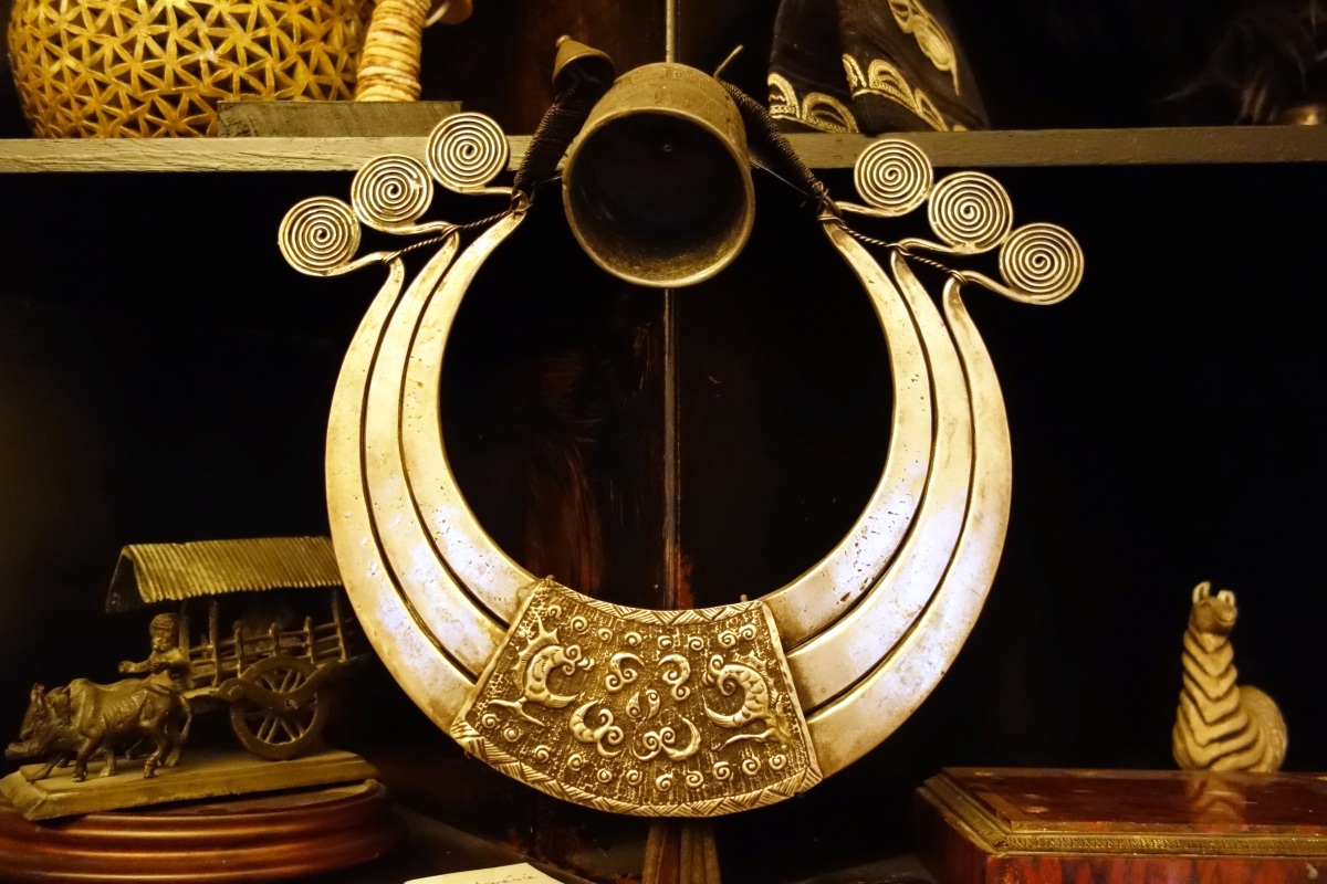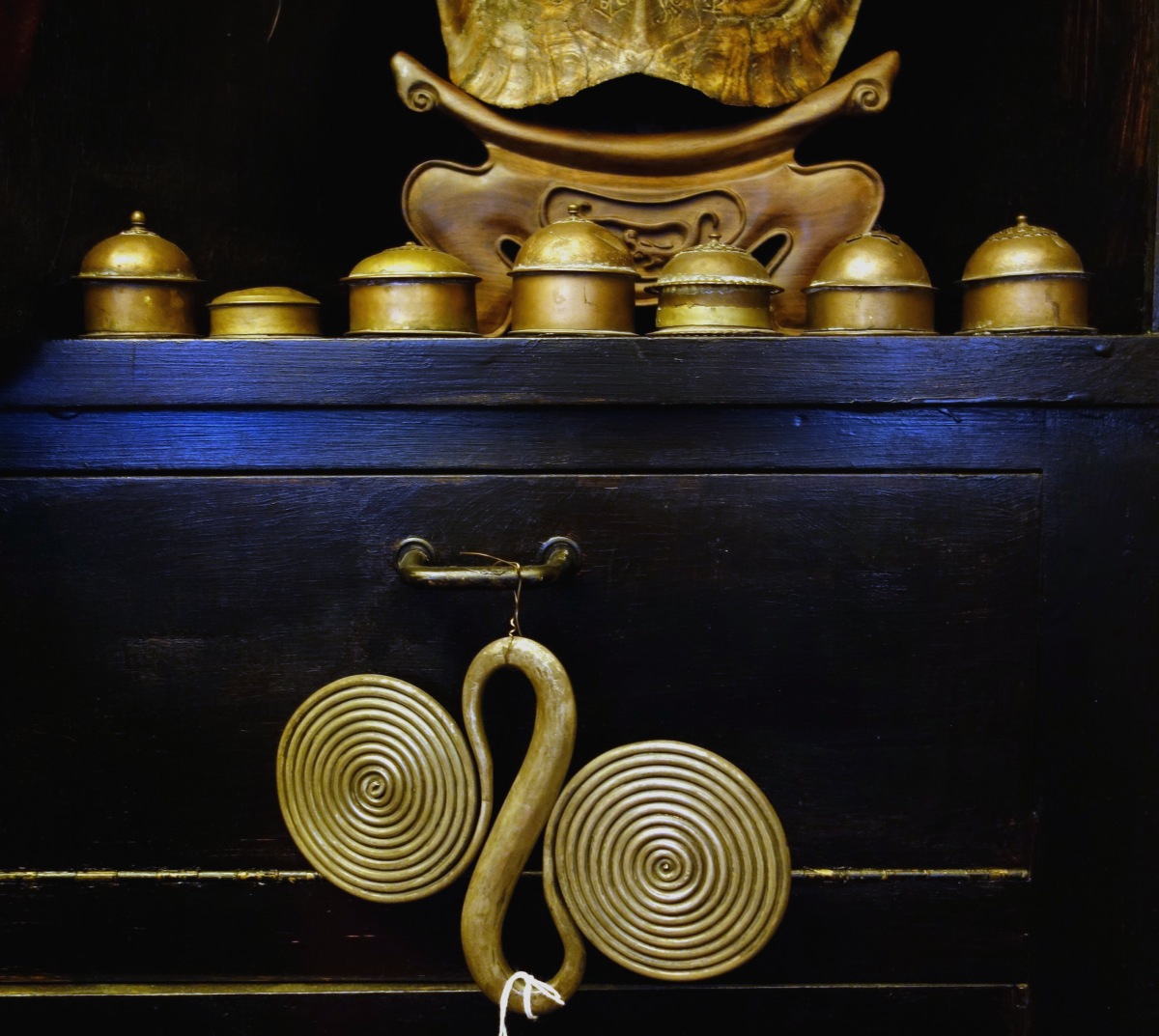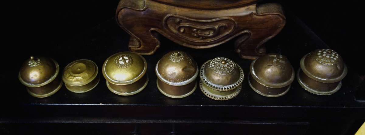 JOINT : CONTRE-POIDS DONG en métal. Haut. 13, Larg. 19 cm. INDE. HUIT STUPA( ?) en forme petites boîtes en laiton à couvercle bombé à décor de motifs géométriques. Haut de 2 à 5 cm.