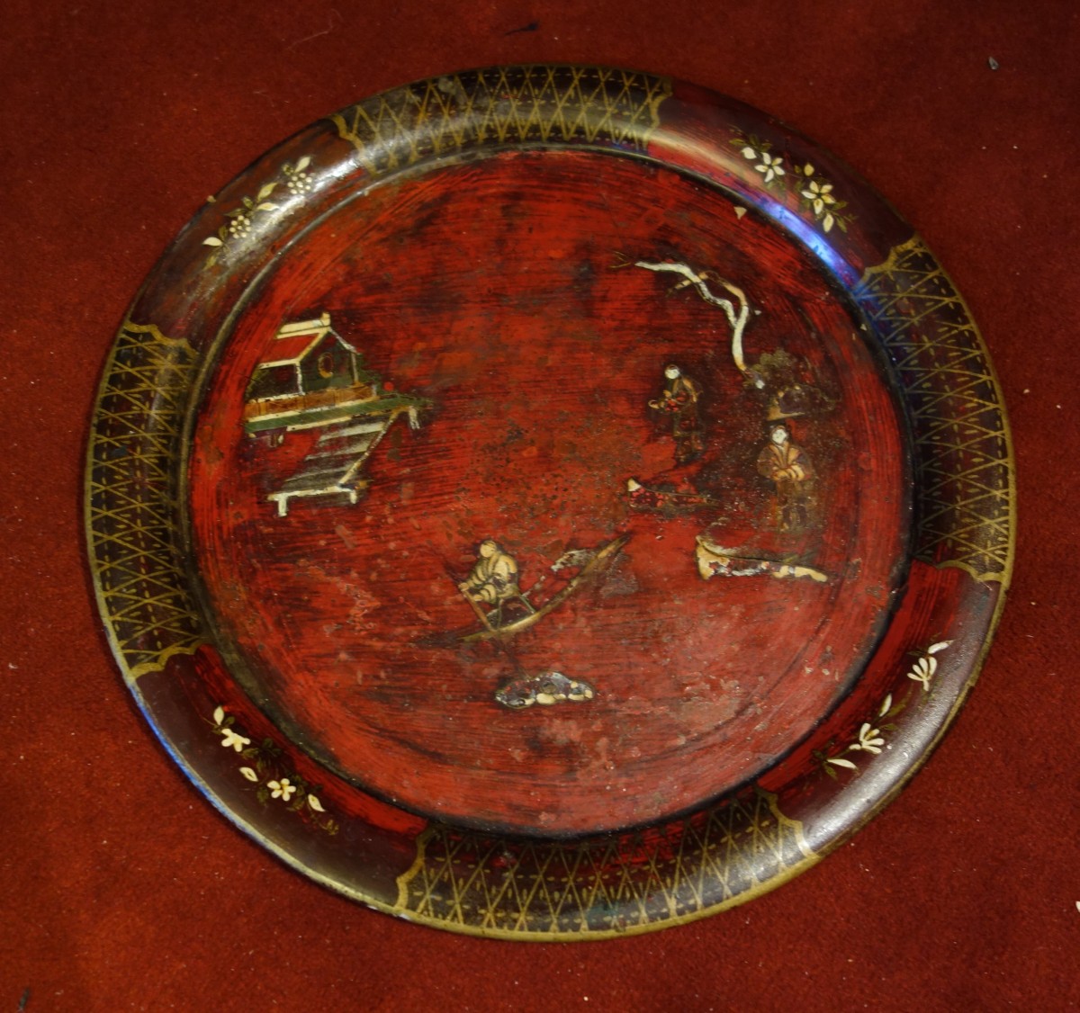 CHINE - Dans le goût de. PLATEAU circulaire en tôle laquée à décor sinisant.