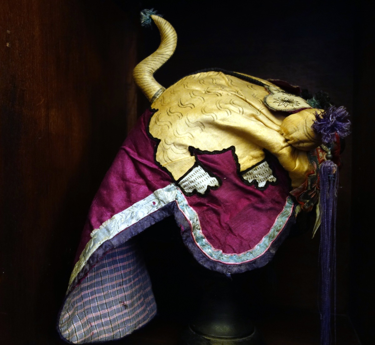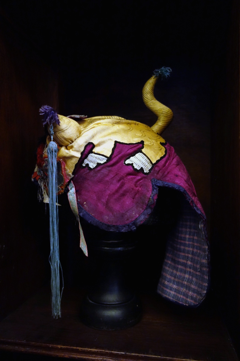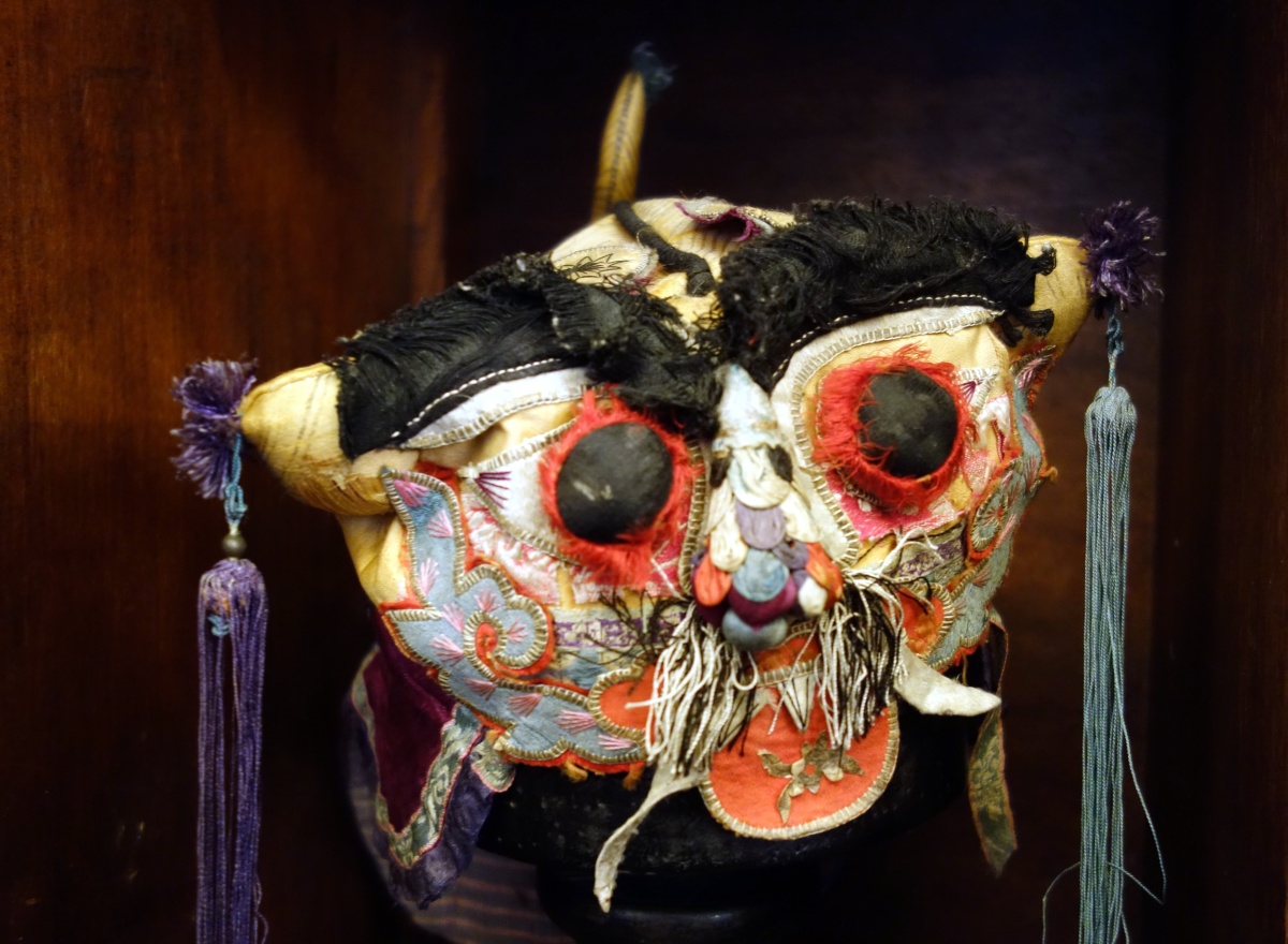 CHINE. MASQUE/BONNET de théâtre chinois en soie brodée.