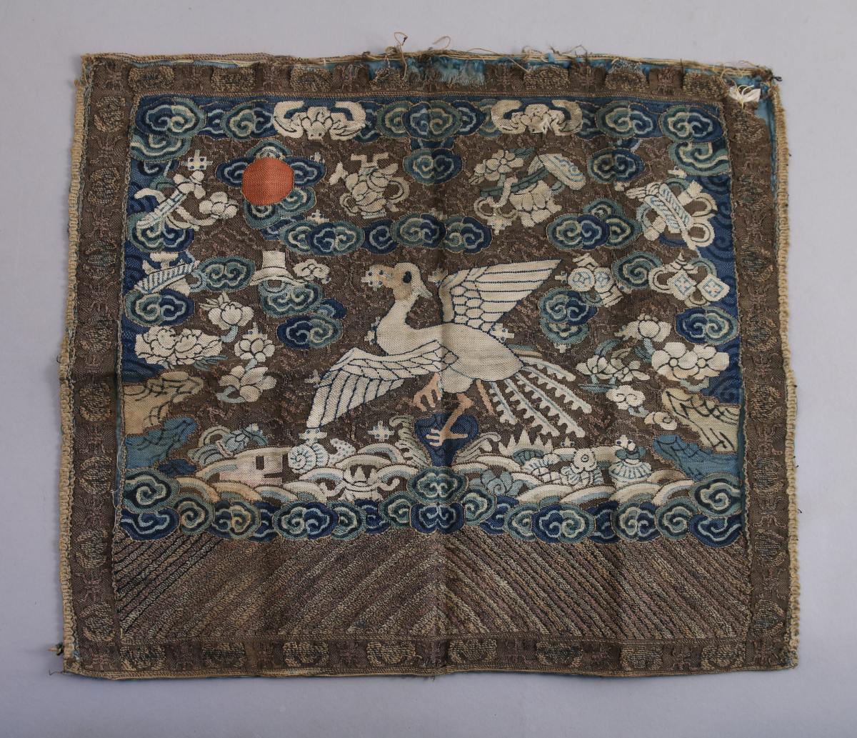 CHINE - XIXe. RÉUNION de SOIERIES. Deux paires de bandes de manches, une bande de manche, soie brodée à décor de grue, soie brodée à décor d'un oiseau debout sur un rocher. Encadrés.
