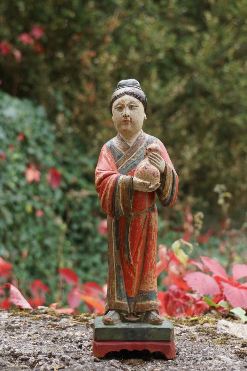 CHINE. STATUETTE en bois sculpté polychrome figurant une dame de qualité tenant une courge.