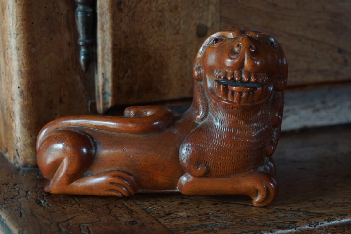 JOINT : CHIMÈRE en bois sculpté ouvrant par une trappe à charnière en-dessous. Yeux incrustés en verre rouge. Asie du Sud-Est. Haut. 10,5, Long. 15 cm.