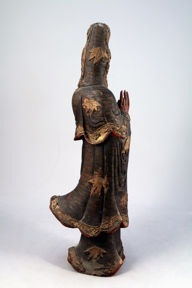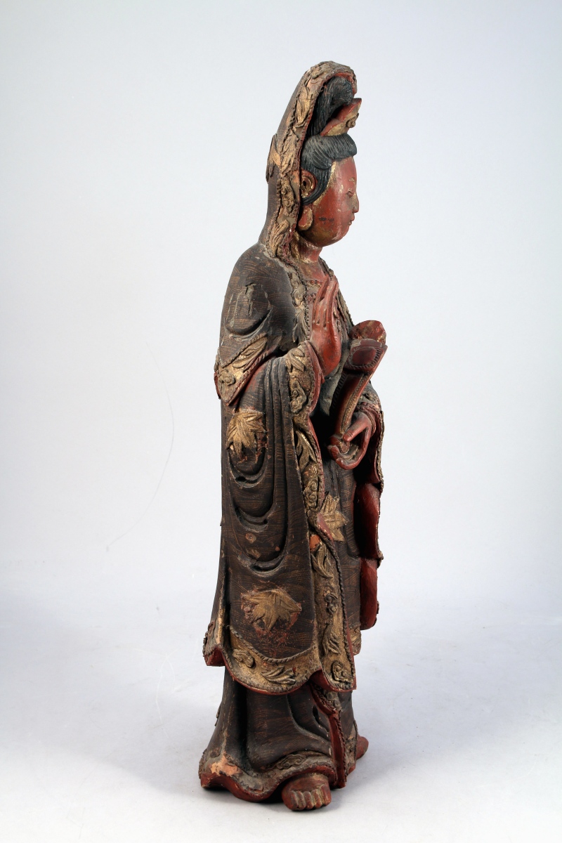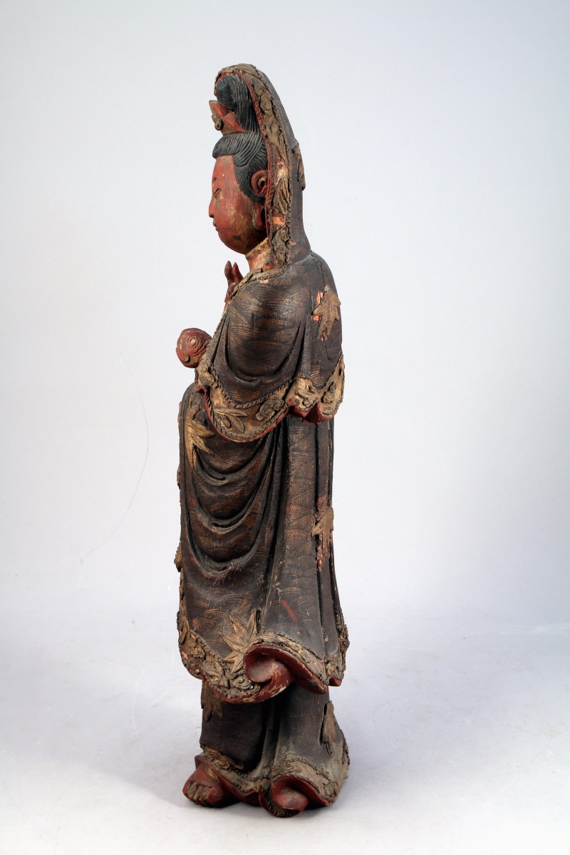 CHINE - Vers 1900. GUANYIN en bois sculpté polychrome, la divinité debout, parée, vêtue d'un manteau richement paré, tient un sceptre ruyi dans une main et fait le geste Vitarka-mudra signe d'argumentation de l'autre.