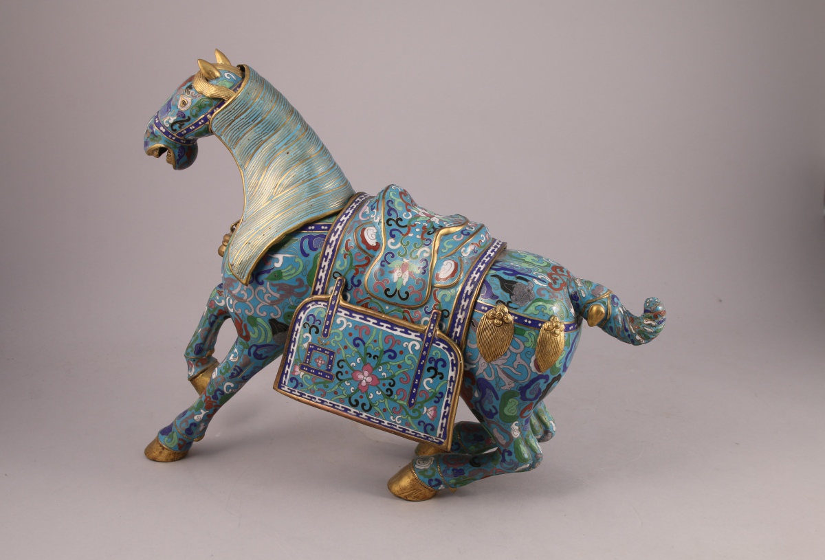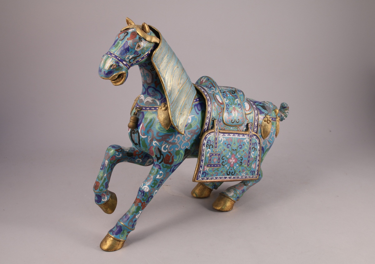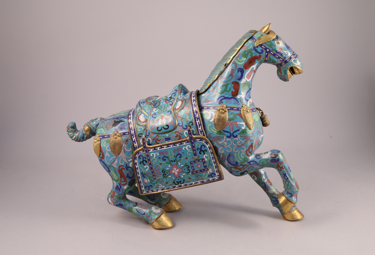 CHINE - XXe. BRÛLE-PARFUM adoptant la forme d'un CHEVAL en bronze à décor d'émaux cloisonnés.
