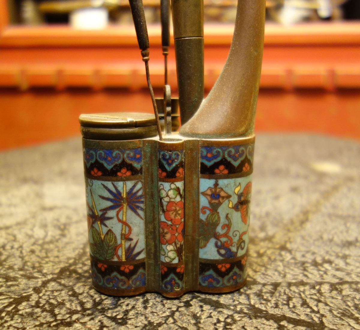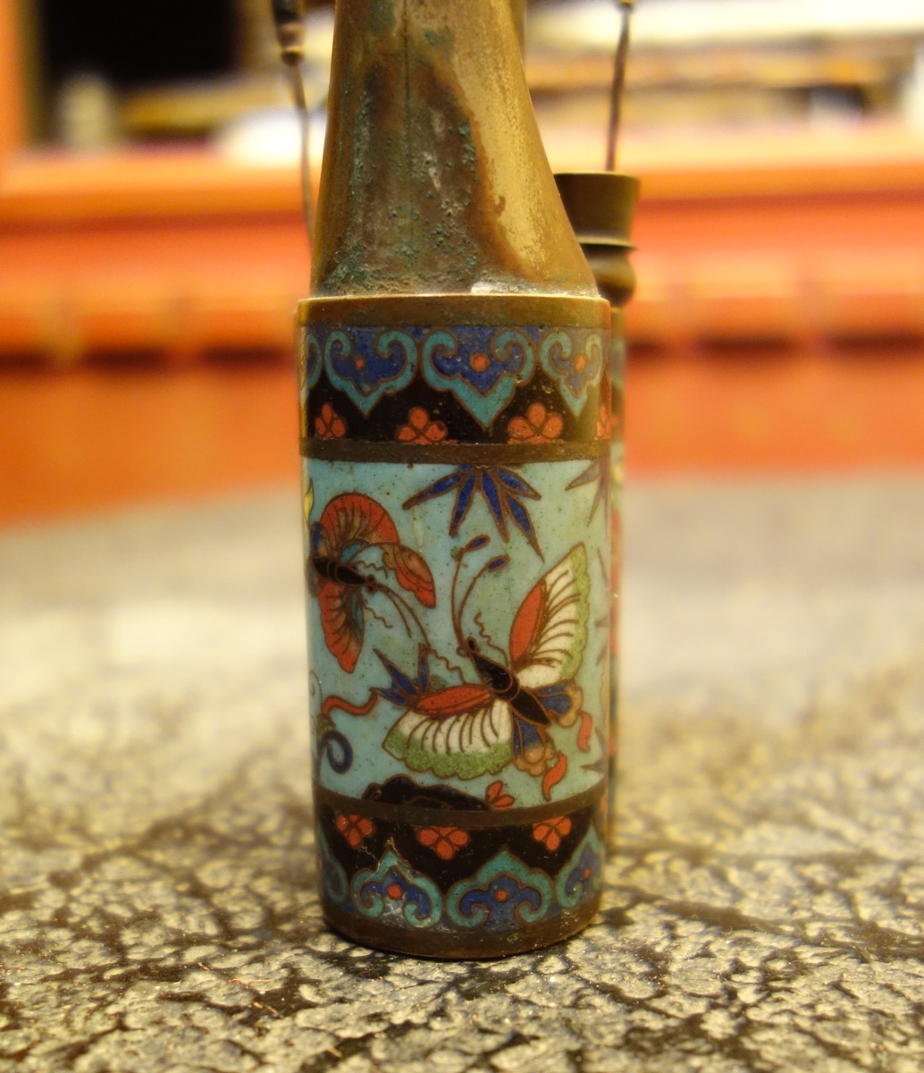 CHINE - XIXe. PIPE en bronze et laiton à décor d'émaux cloisonnés figurant des papillons et de fleurs sur un fond turquoise.