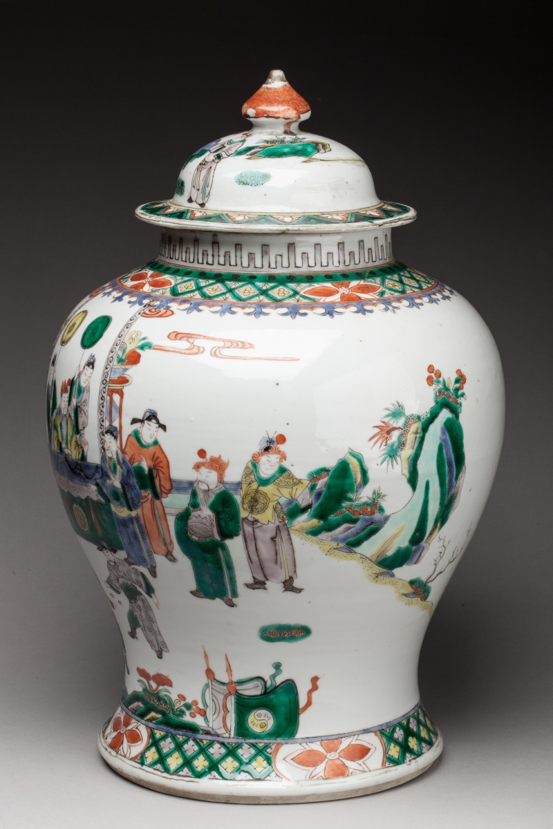 CHINE - Fin XIXe. POTICHE de forme balustre en porcelaine à fond blanc à décor polychrome d'une scène de palais et rochers. Cachet en bleu sous couverte.